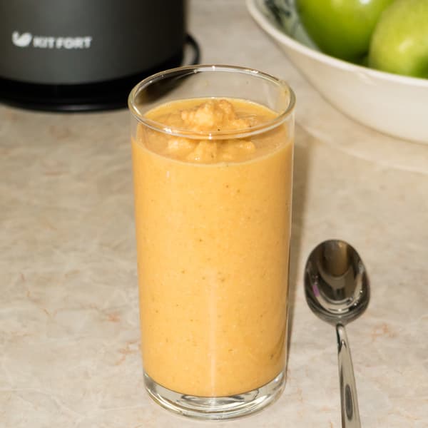 За 30 секунд прибор измельчил и тщательно смешал все ингредиенты. Готовый смузи получился густой, консистенция однородная, без различимых кусочков продуктов. При употреблении готового блюда мы не встретили ни единого определяемого кусочка моркови, фрагмента семечек или орехов. Для такого размера ножей и небольшого размера самого блендера это прекрасный результат. Отметим также, что продукты были измельчены с добавлением совсем небольшого количества жидкости. Мощность блендера во время работы лежала в пределах 280 Вт, доходя в пиковые моменты до 370 Вт.