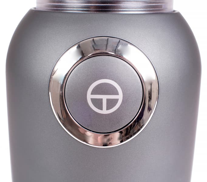 При первом взгляде блендер Kitfort KT-1363 радует. Корпус обтекаемой формы и приятного темно-серого цвета не выглядит дешево. Дизайн минималистичный и, на наш взгляд, элегантный. На лицевой стороне моторного блока расположена кнопка запуска работы, вся остальная поверхность «чистая».