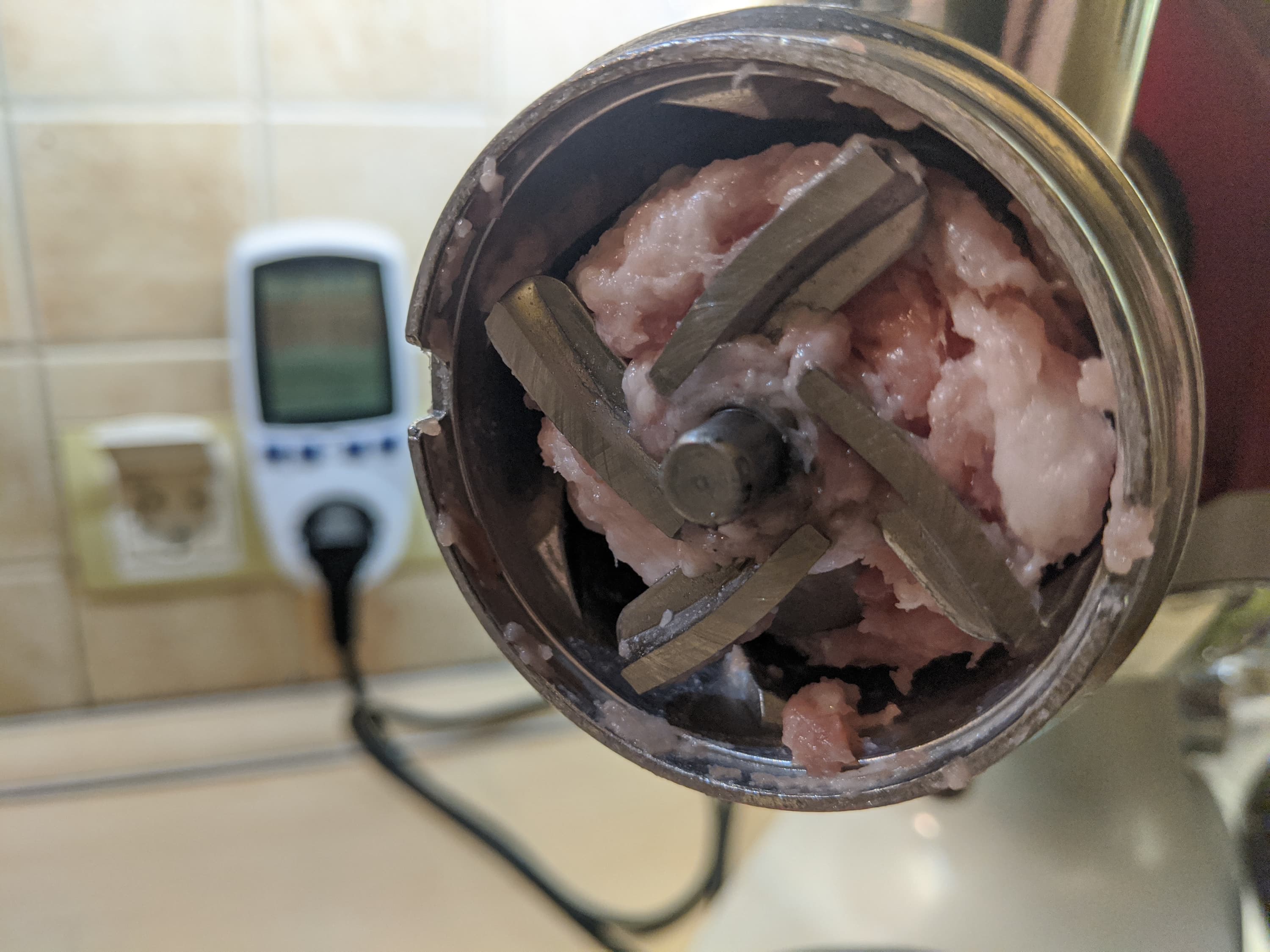 Для тестирования мы взяли мякоть свиного окорока, удалив большую часть жил и жира и нарезав мясо длинными полосами такой толщины, чтобы они проходили в горловину мясорубки без проталкивания, и включили мясорубку (на максимальную скорость) и секундомер.