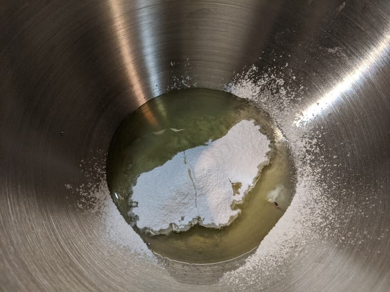 В чашу мы положили 3 столовые ложки сахара, залили их 200 миллилитрами сливок и 150 миллилитрами горячей воды. Полученную смесь размешали насадкой для смешивания в ленивом режиме — так, чтобы сахар разошелся, не более. Добавили 12 граммов сухих дрожжей и оставили дрожжи работать на 20 минут.