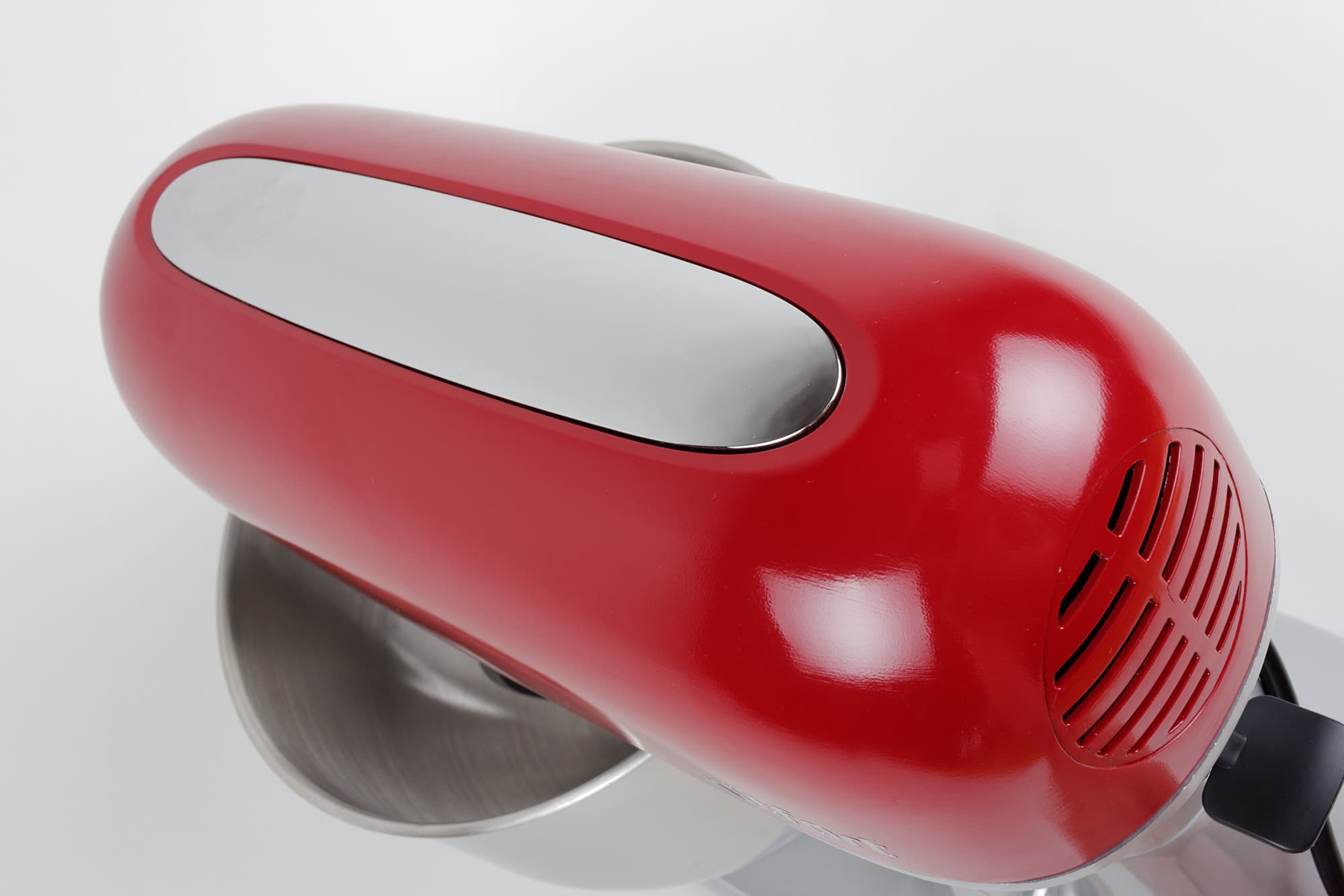 KT-1367 оказался очень внушительным прибором с тяжелым и крупным моторным блоком — и правильно, ведь он должен обеспечивать надежную работу и устойчивость всего планетарного миксера. Моторный блок состоит из нижней части со станиной, на которую крепится чаша миксера и верхней подвижной части, которая обеспечивает крепление насадок миксера или мясорубки.