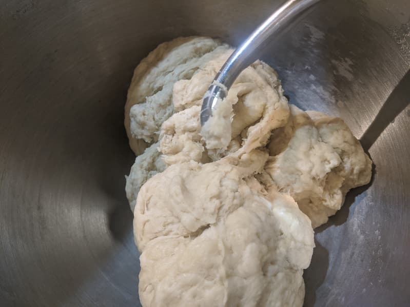 Муку мы просеяли в чашу, разбили туда же яйцо, добавили масло и воду и включили миксер на третью скорость. По рецепту надо было вымешивать его от 5 до 8 минут, но уже через пять минут мы сочли тесто готовым: оно собралось в ровный гладкий ком, который можно было даже не оставлять вылеживаться, как это советуют делать с тестом для лапши. На стенках при этом не было никаких следов муки, вся она замешалась в тесто.