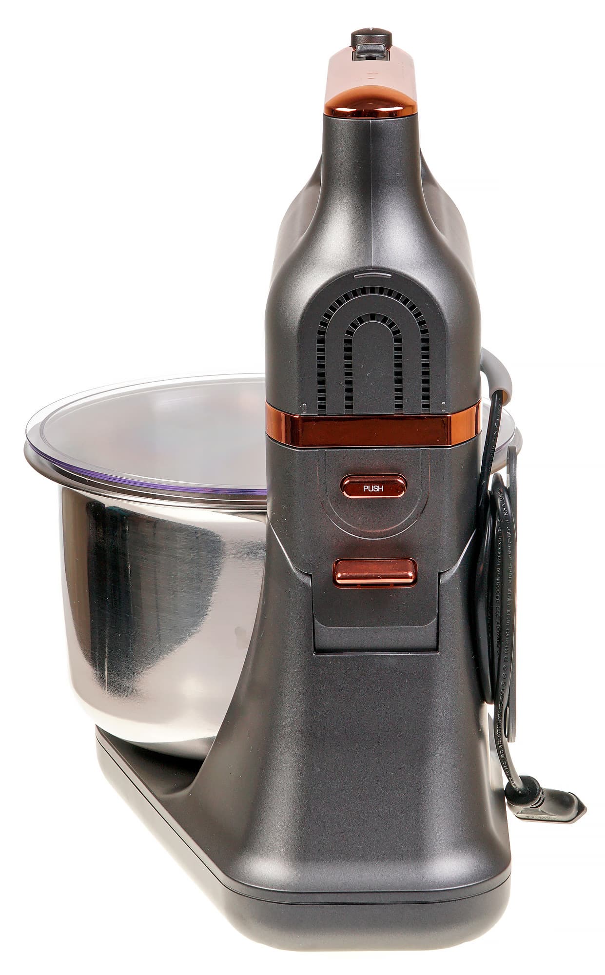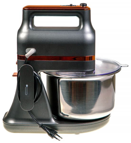 Дизайн устройства интересный и гармоничный: серо-стальной пластик со вставками медного цвета и скругленные углы. Внешне миксер нам понравился.