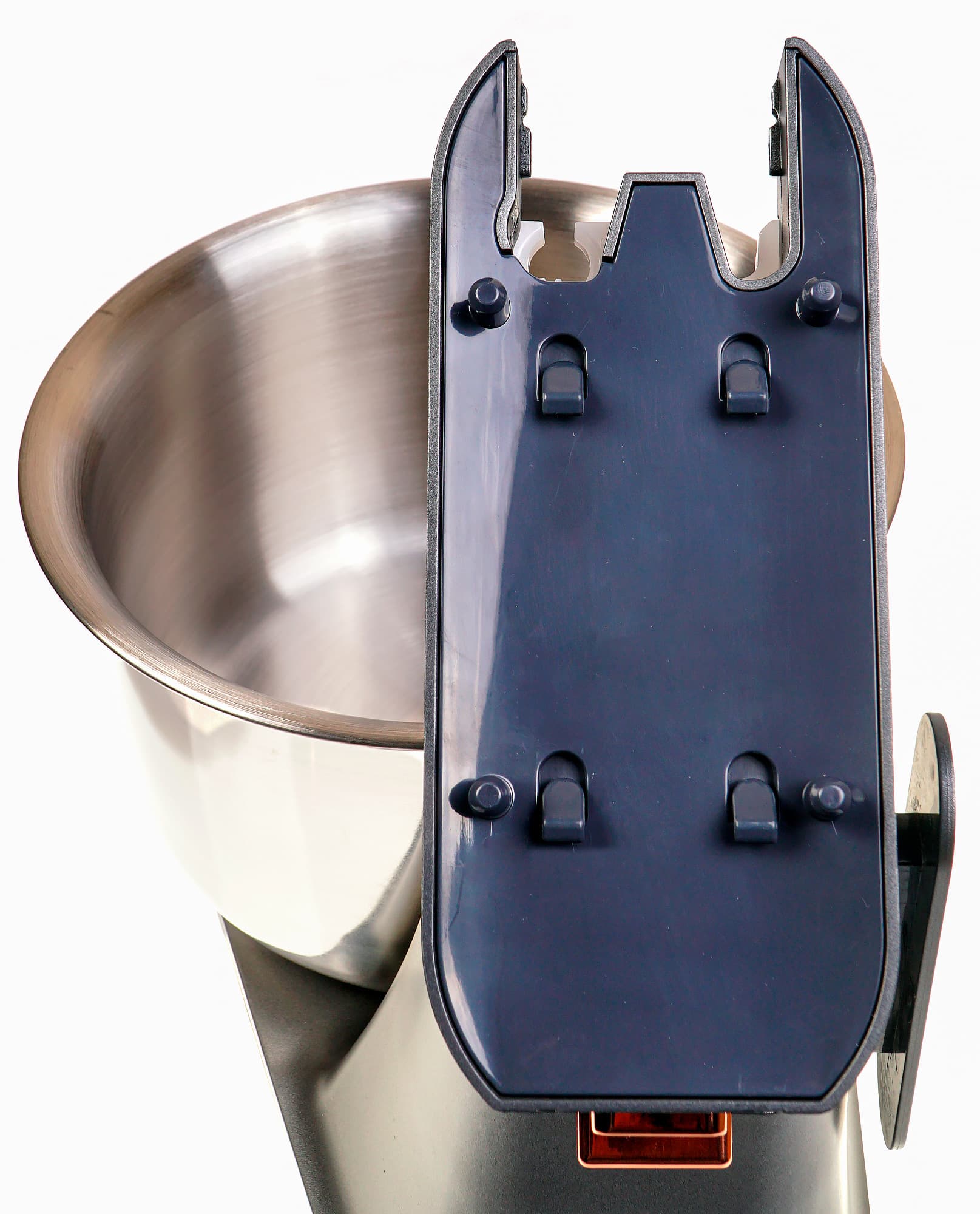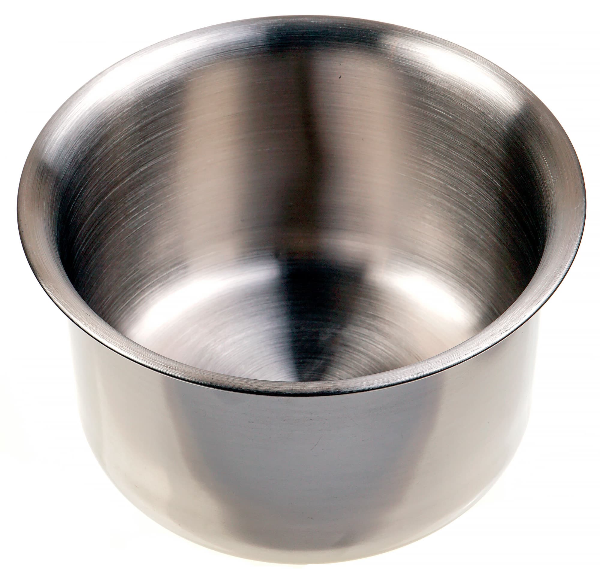 Чаша изготовлена из нержавеющей стали и имеет объем 3,5 литра. Снизу к чаше приклепан пластиковый крепеж для установки на поддон, поэтому использовать чашу отдельно от миксера для готовки на плите или в духовке невозможно.