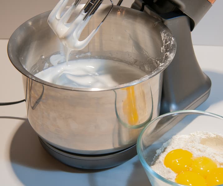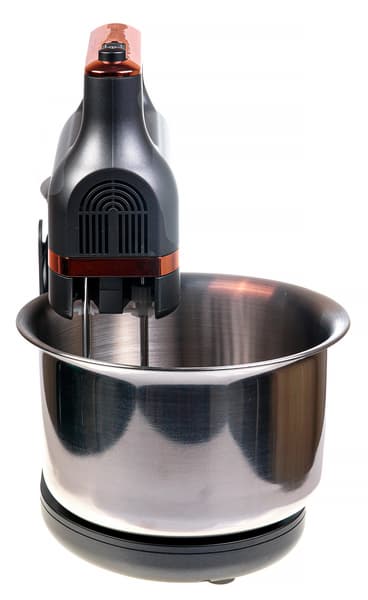 Миксер отлично справляется с взбиванием, особенно хочется отметить взбивание малого количества белков или сливок. Начать взбивать совсем небольшое количество продуктов можно в ручном режиме, не устанавливая чашу на поддон, а слегка наклонив ее. А когда продукты немного увеличатся в объеме — установить миксер на платформу и использовать его как планетарный.
