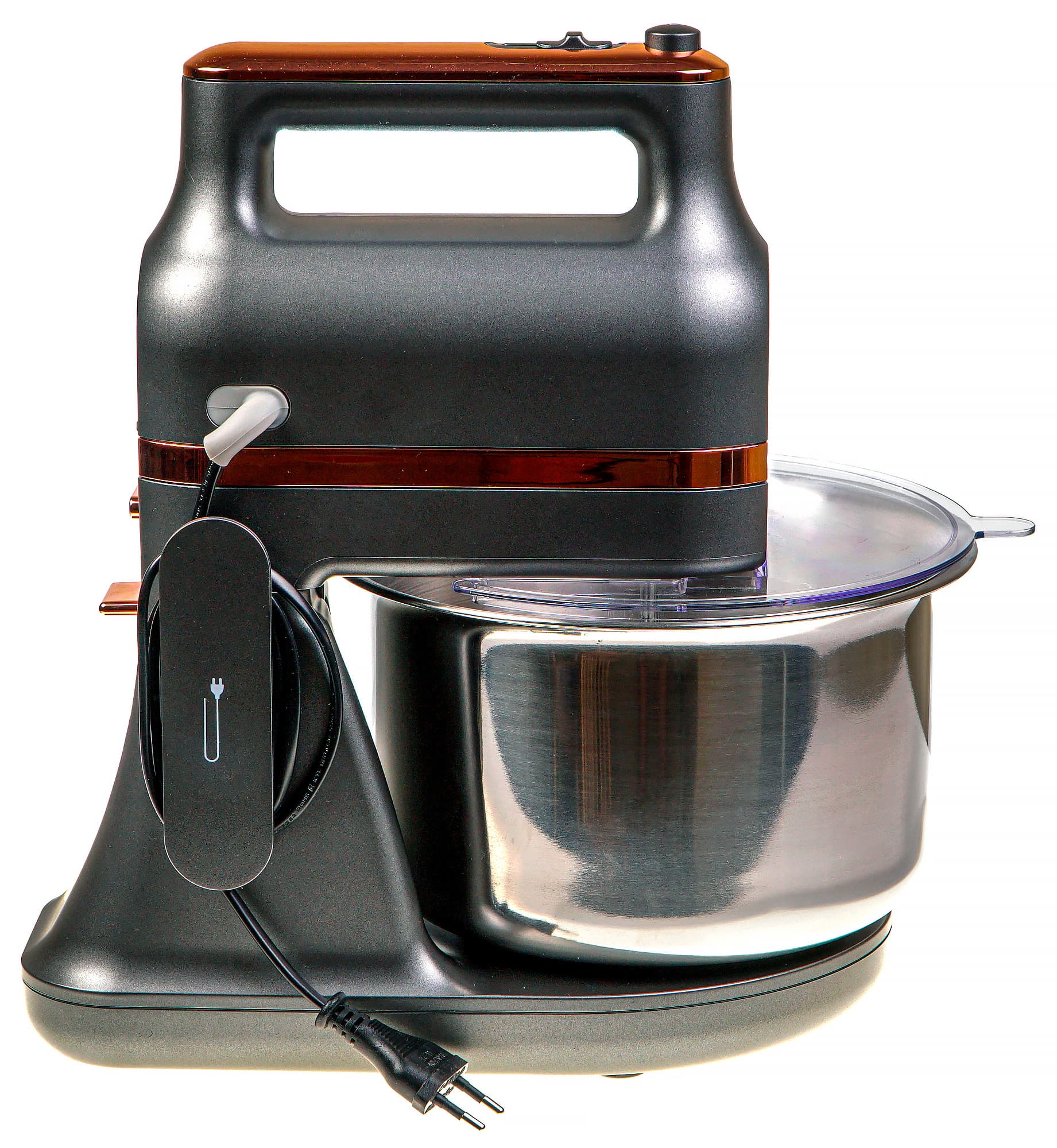 На корпусе есть боковая панель для наматывания шнура питания. К платформе, после установки на нее миксера, можно прикрепить пластиковую прозрачную крышку для защиты от брызг.