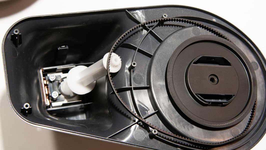 Когда миксер установлен на платформу корпуса, пластиковая шестерня, находящаяся на одной из двух насадок, входит в зацепление с шестерней внутри платформы. От нее через внутренний механизм и зубчатый приводной ремень вращение подается на поддон основания корпуса, в который вставляется чаша миксера.
