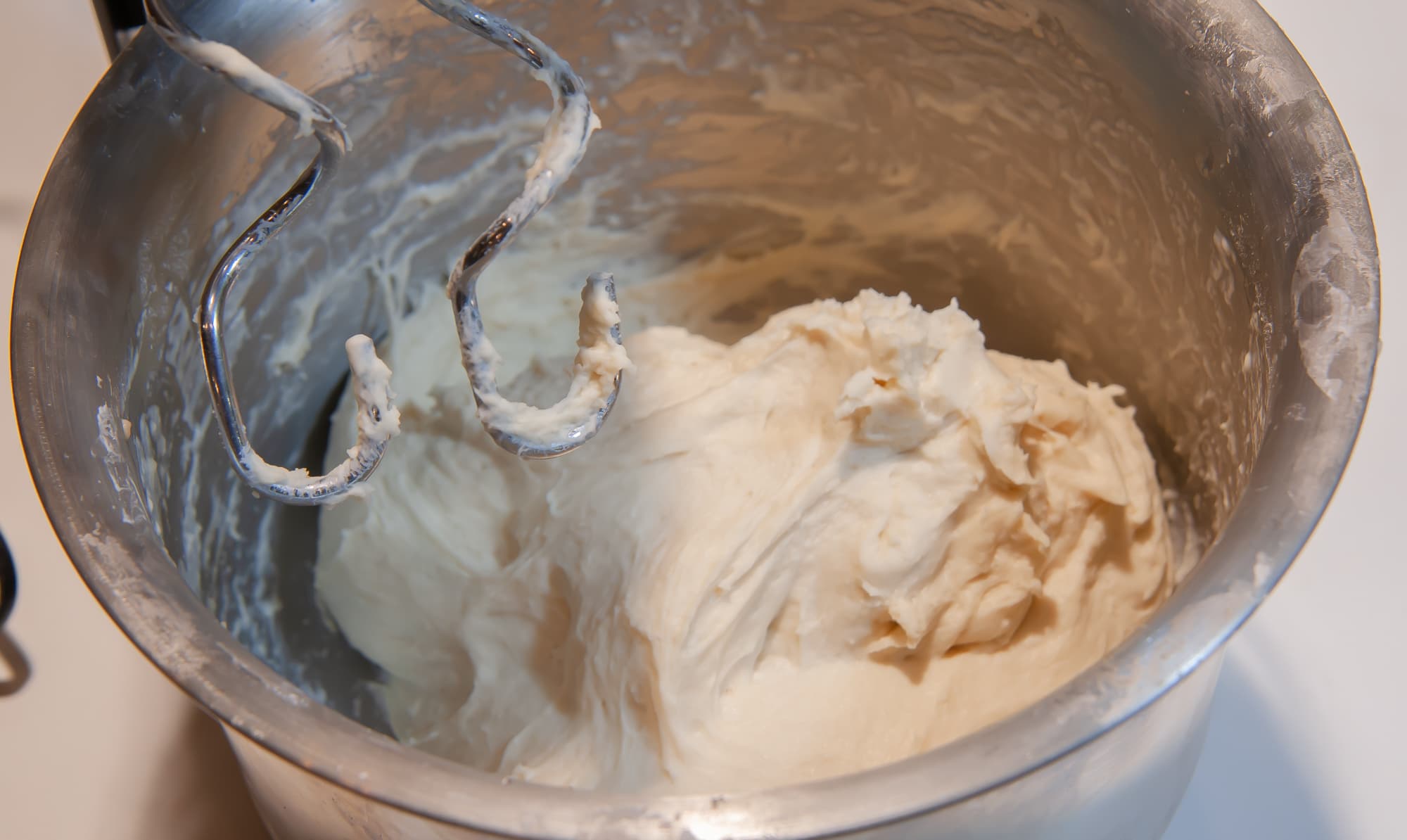 Для приготовления штруделя требуется тесто более тугое, чем для пельменей. У нас получилось замесить до однородности тесто из 500 г муки и 300 г воды, остальные 100-150 г муки нам пришлось вмешивать в тесто вручную. При меньшем объеме ингредиентов миксер начинает хуже справляться даже с чуть менее тугим тестом: оно наматывается на крюк и не перемешивается.