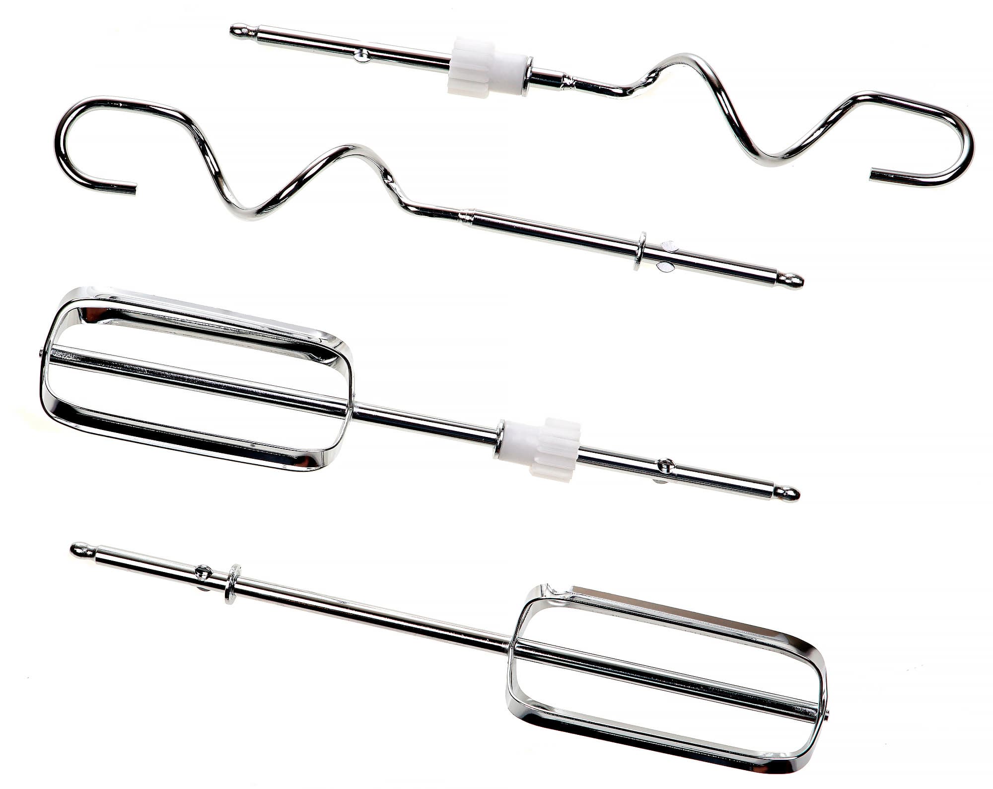 Насадок в комплекте к миксеру две пары, это стандартные венчики для взбивания и крюки для замеса теста. Единственное визуальное отличие — на одной насадке из пары напрессована небольшая пластиковая шестерня.