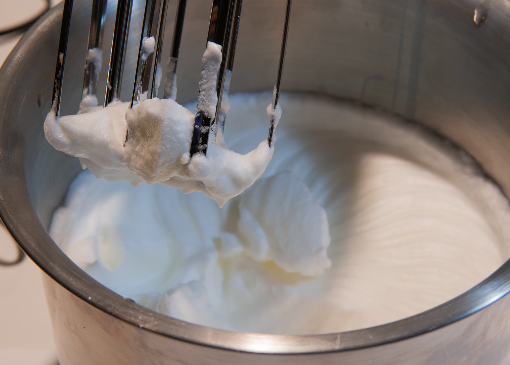В чаше миксера взбили 185 г сахара и 4 белка до максимально устойчивой пены. Мы не вводили сахар постепенно, а насыпали его сразу к белкам, включили среднюю мощность и взбивали около 15 минут с одним перерывом.