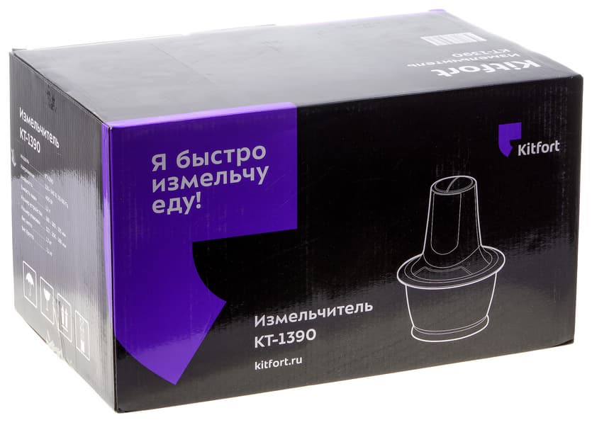 Упаковка, как и всегда у Kitfort, лаконична: на черно-фиолетовом фоне белый силуэт прибора, название, модель. По бокам технические характеристики и некоторая информация о работе устройства. Коробка небольшая, да и весит немного, и все же снабжена ручкой для переноски.