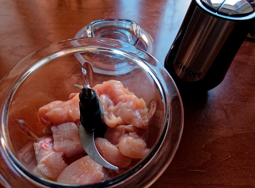 400 граммов куриного филе порезали на небольшие кусочки и отправили в чашу. Использовали оба ножа.