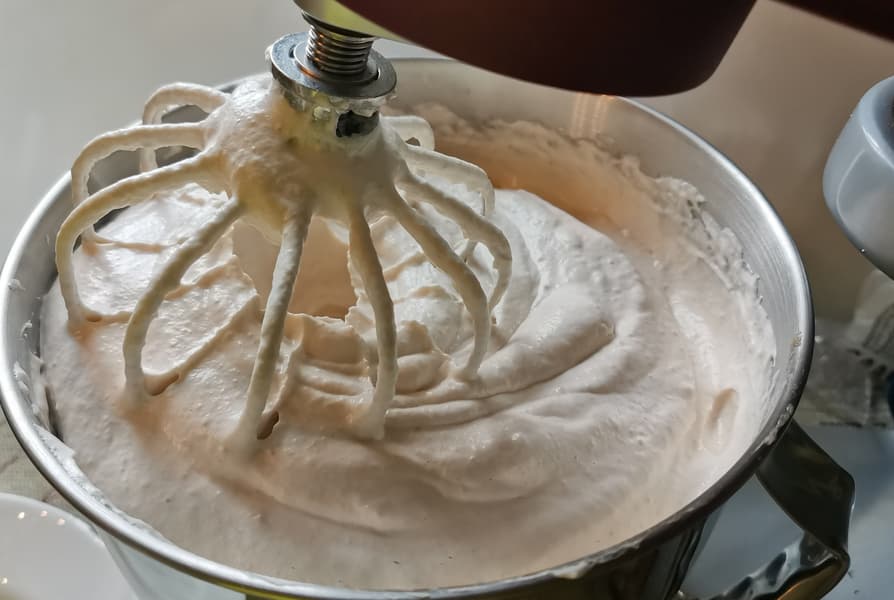 В чашу миксера положили 800 мл охлажденного яблочного пюре и добавили белок 1 яйца. Взбивали венчиком для взбивания на скорости 6-8 приблизительно 10 минут.