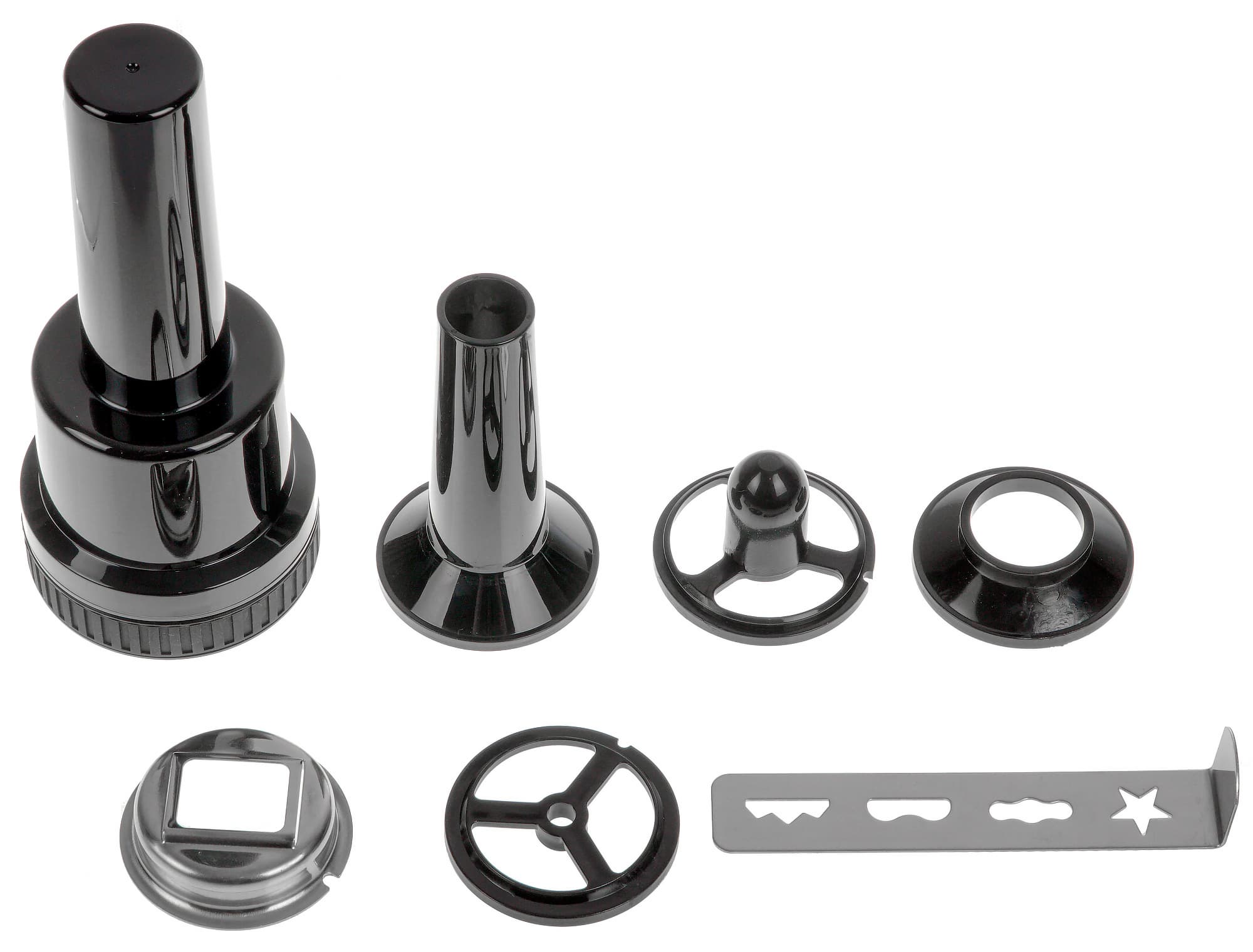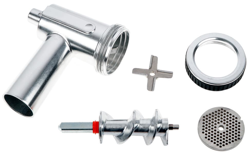 Дополнительно к мясорубке поставляются многочисленные насадки — для кеббе, колбасок, печенья, формованных изделий из теста. Все они, кроме полосы для формовки изделий из теста, удобно складываются в пластиковый толкатель с винтовой крышкой.
