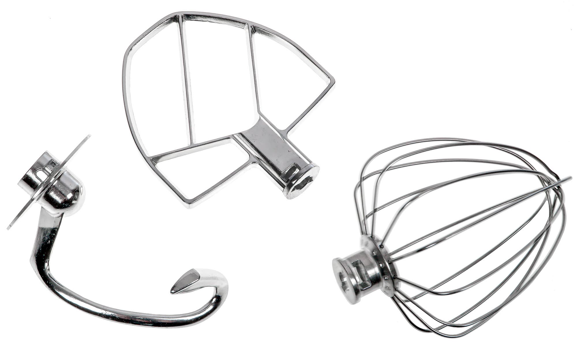 В комплекте к миксеру идут 3 полностью металлические насадки — венчик для взбивания, крюк для замеса тугого теста и насадка для смешивания. Насадки быстро и удобно надеваются и снимаются.