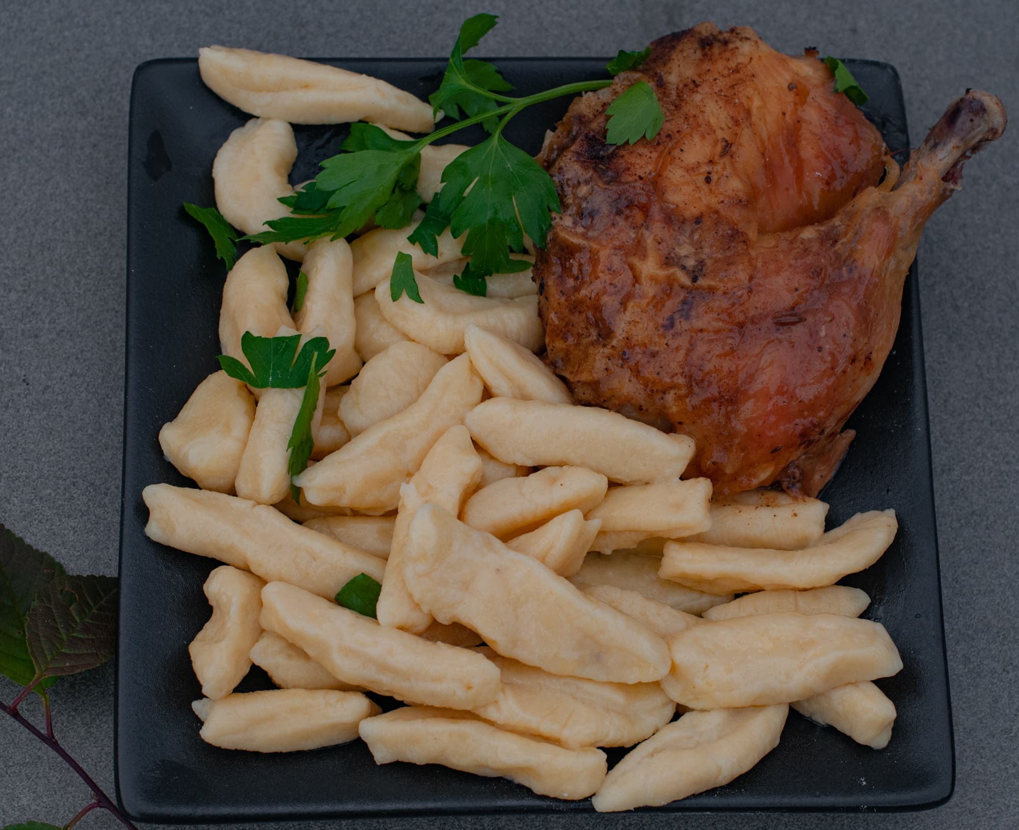 Раскатали тесто руками в небольшие колбаски, порезали их ножом на одинаковые кусочки и сварили в кипящей воде до готовности. Подали с маслом и курицей.