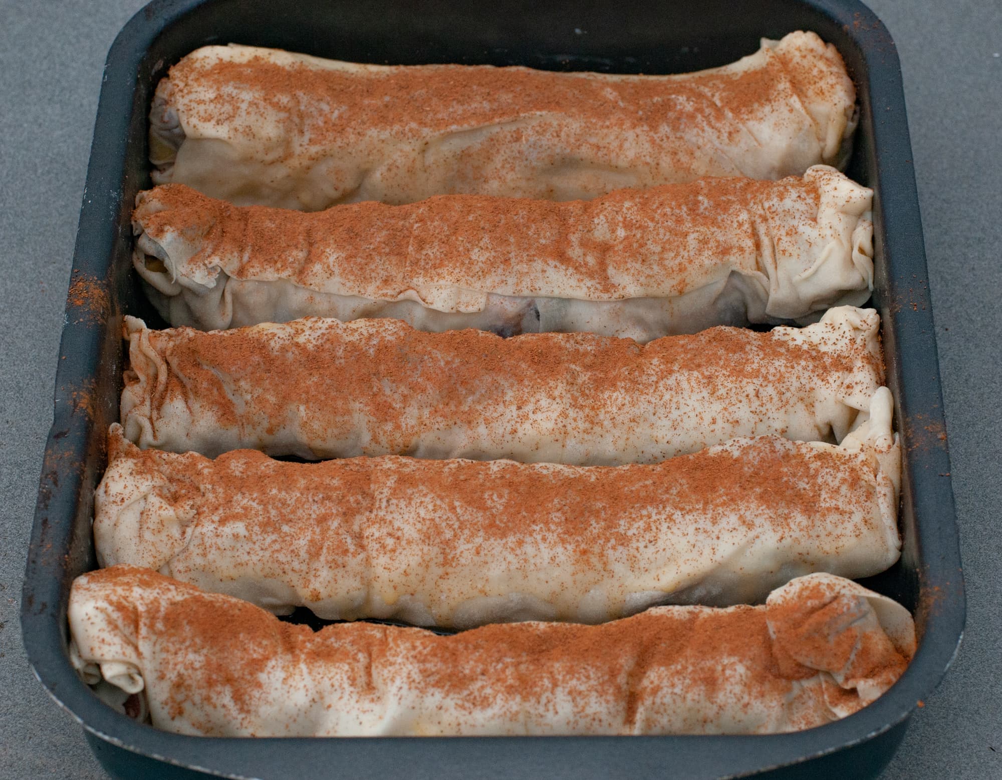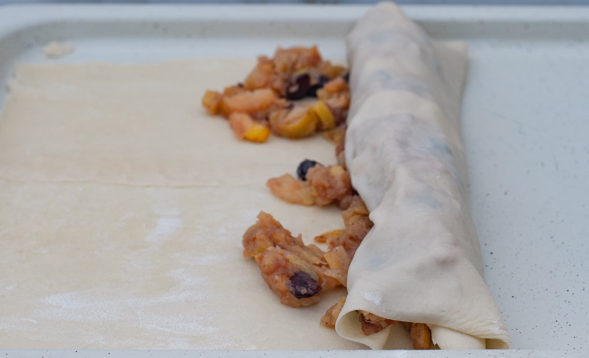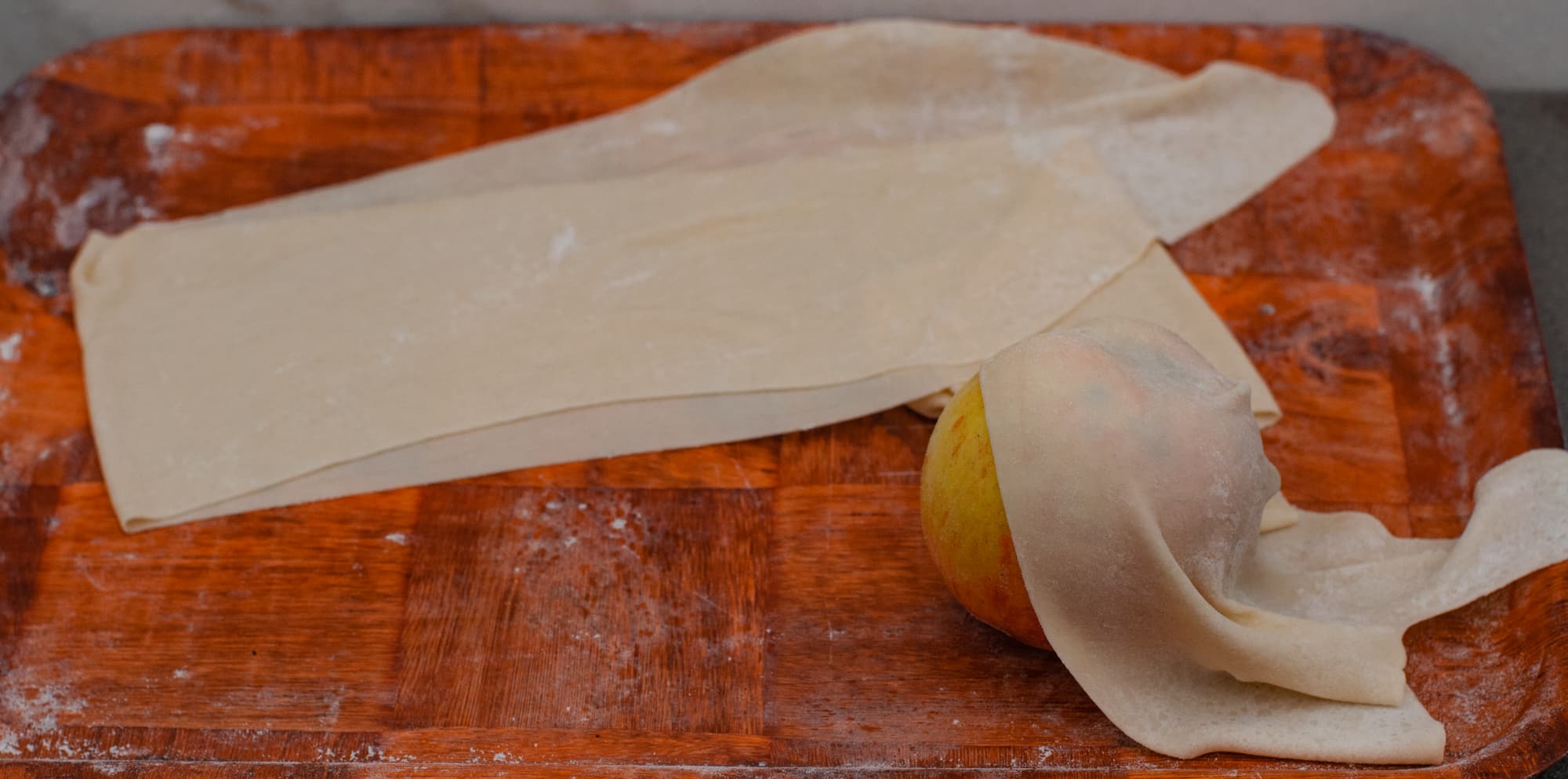 В чаше миксера мы приготовили тугое тесто для штруделя (мука, вода, соль). Раскатали тесто с помощью тестораскатки до очень тонкого пласта. Для этого тесто сначала раскатывали на среднем расстоянии между валиками, присыпали мукой и продолжили раскатывать уже на минимальном. Если в пласте образовывались дырки или край получался неровный, мы складывали пласт пополам и прокатывали еще раз. Готовые пласты получаются максимум 14 см шириной, поэтому мы укладывали по два пласта с небольшим припуском рядом и сращивали их, приминая пальцами. Таким образом, удавалось добиться размера пласта приблизительно 25×40 см.