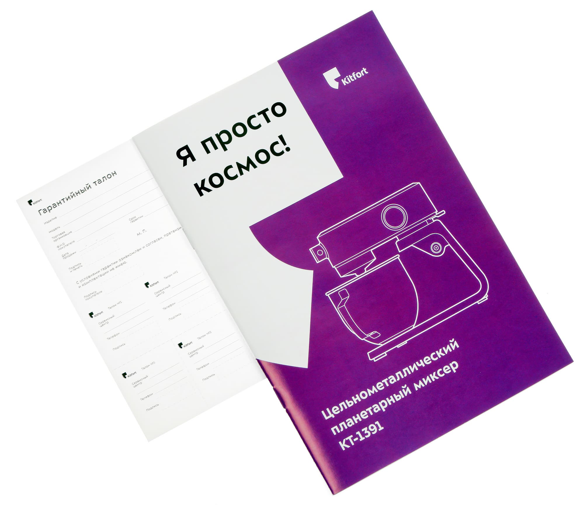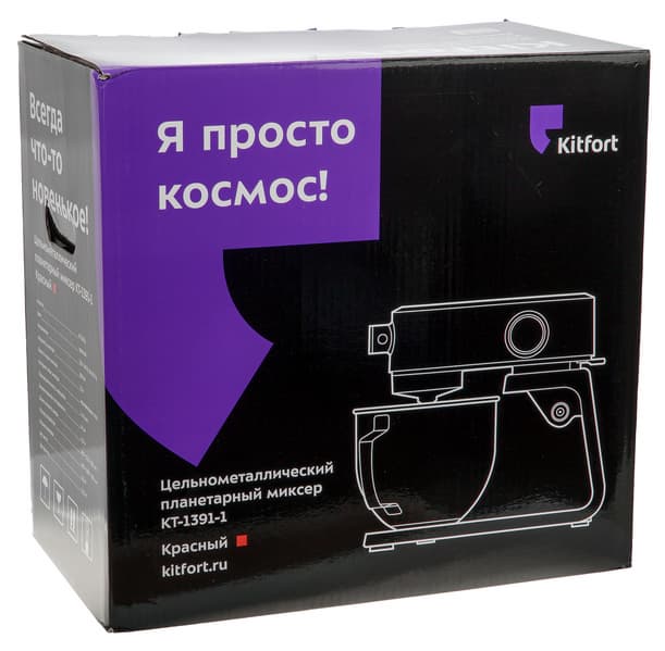 Планетарный миксер КТ-1391 прибыл на тестирование в большой картонной коробке стандартного оформления: на фиолетовом с черным фоне — белый текст со схематическим рисунком прибора, рекламные слоганы и основные технические характеристики модели. В коробке есть прорези-ручки для удобства переноски, сам прибор упакован в полиэтилен и надежно закреплен пенопластовыми вставками.