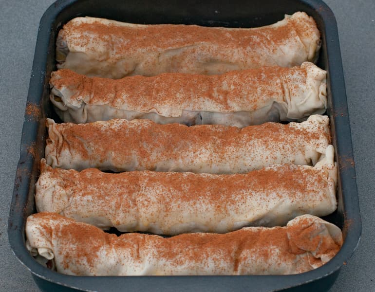 Выложили рулеты в емкость, смазанную маслом. Готовили в духовке при 190 °C 35 минут.