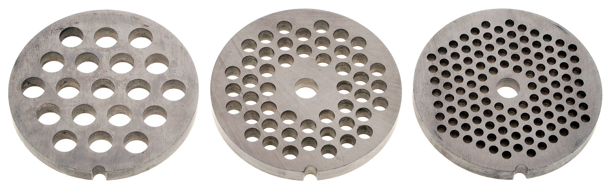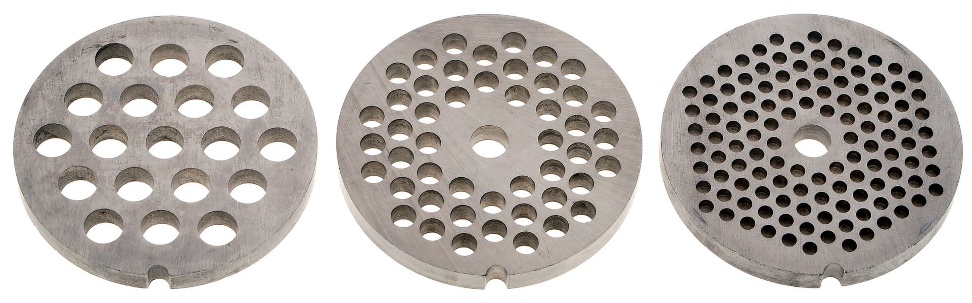 В комплекте мясорубки три решетки — с мелкими (3 мм), средними (5 мм) и крупными (8 мм) отверстиями.