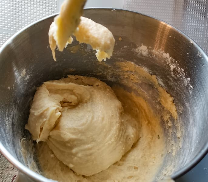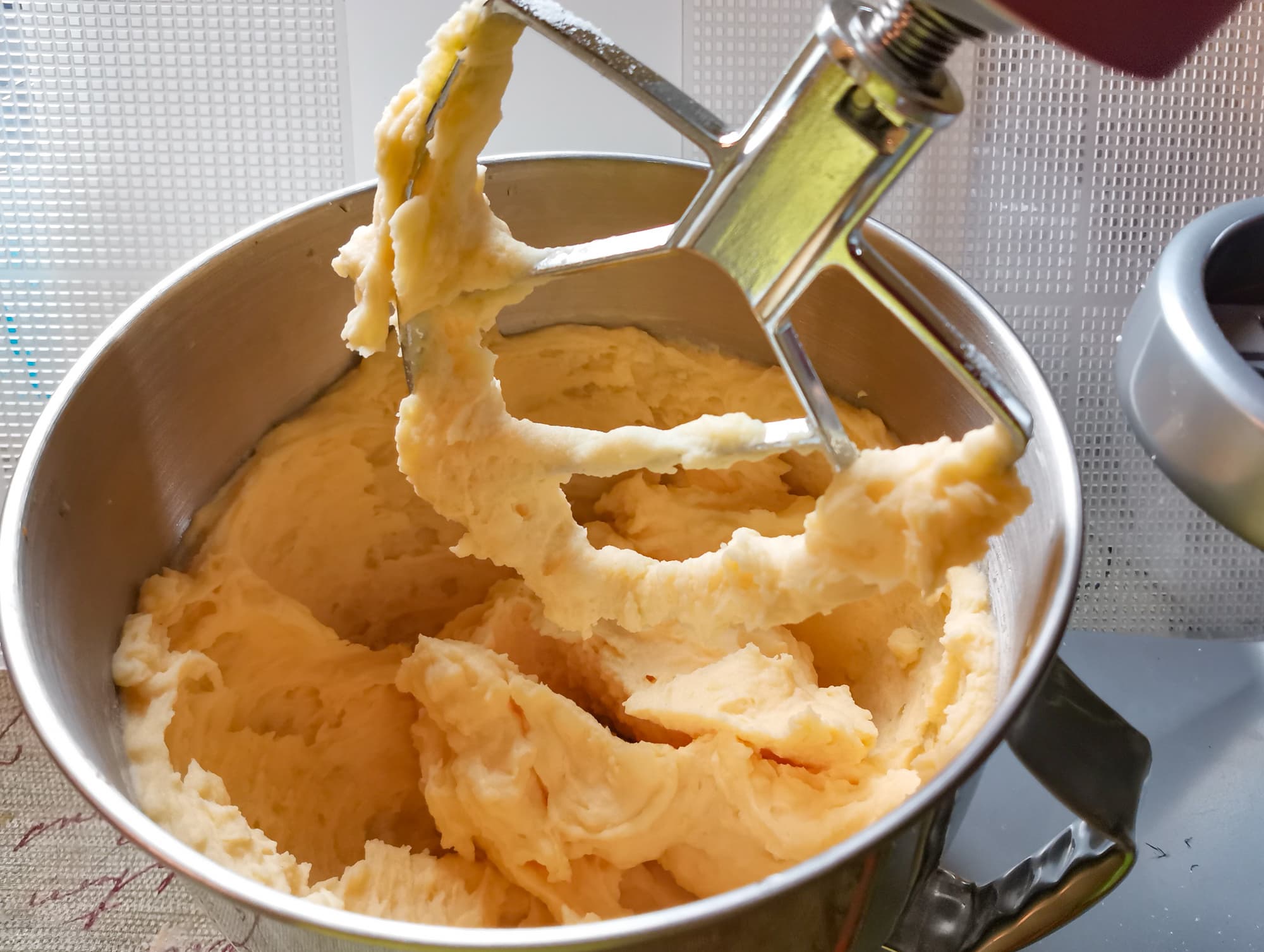 К пюре досыпали муки и крюком замесили среднетугое тесто. Тесто вымешивали недолго, около 3 минут.
