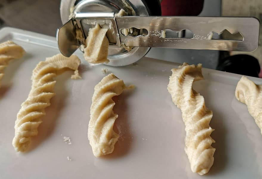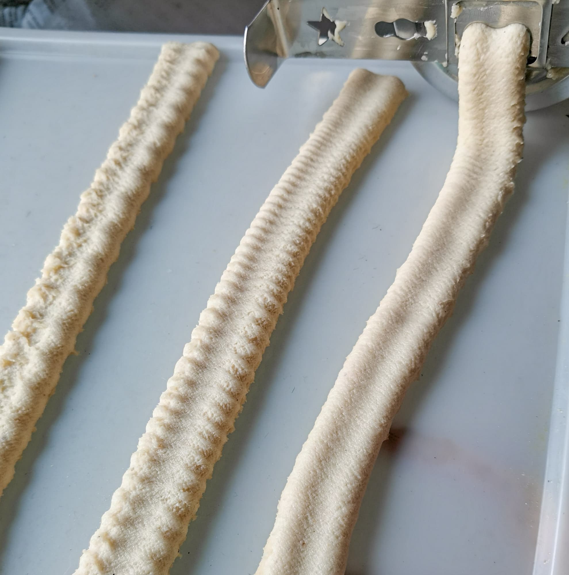 Песочное печенье мы готовили по рецепту из инструкции к прибору. После того, как тесто подержали в холодильнике несколько часов, с помощью выдавливающей насадки для форменных изделий мы сформировали печенье.