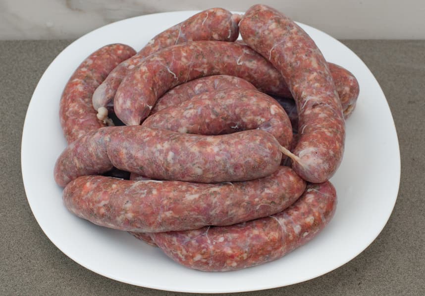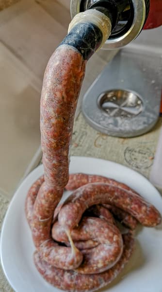 Из получившегося фарша с добавлением специй с помощью насадки для купат мы приготовили пару килограммов колбасок для жарки. Насадка для приготовления купат надевается непосредственно на шнек, без ножа и решеток, поэтому фарш не перемалывается повторно.