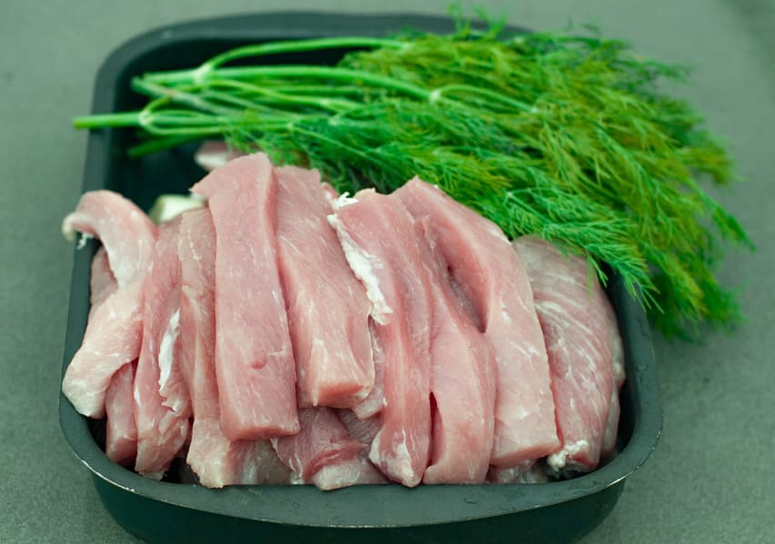 Для теста мы взяли охлажденную свинину, срезали с нее все жилки и излишний жир, порезали на куски, удобные для закладывания в мясорубку.