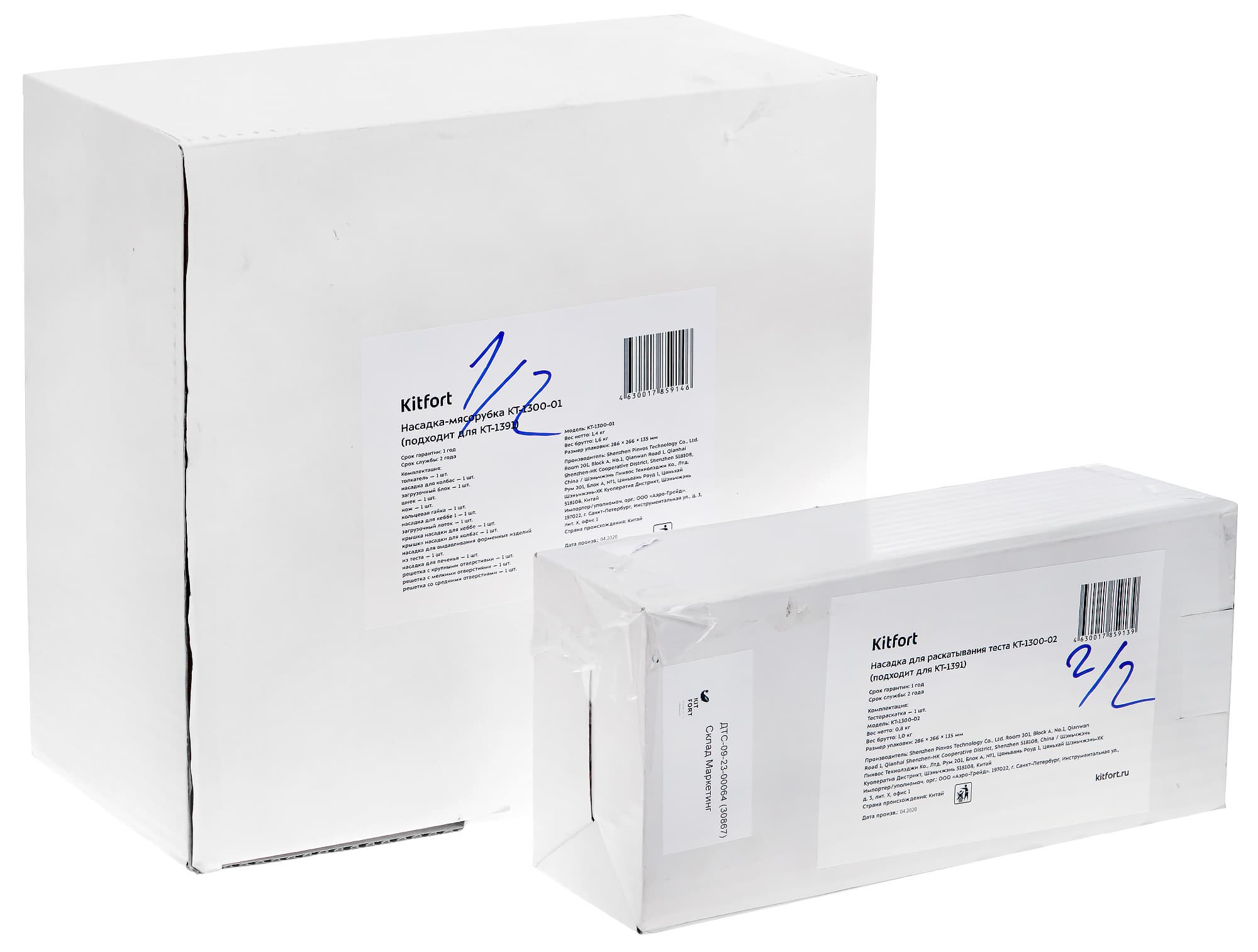Дополнительно к миксеру в отдельных небольших картонных коробках пришли мясорубка и тестораскатка. В основную комплектацию прибора они не входят и при необходимости докупаются отдельно. Коробки с дополнениями из обычного картона с наклеенными этикетками, содержащими техническую информацию об изделиях.