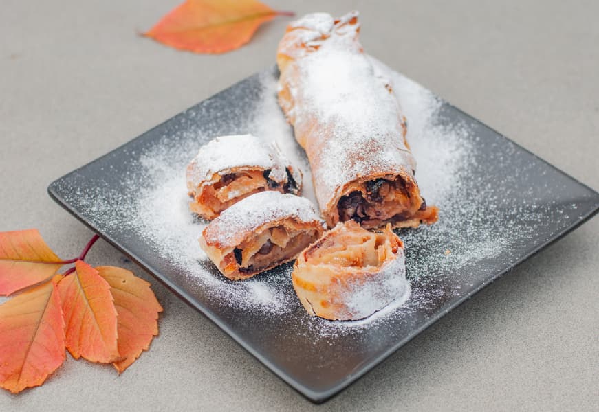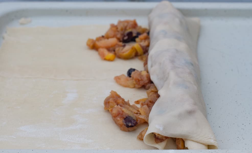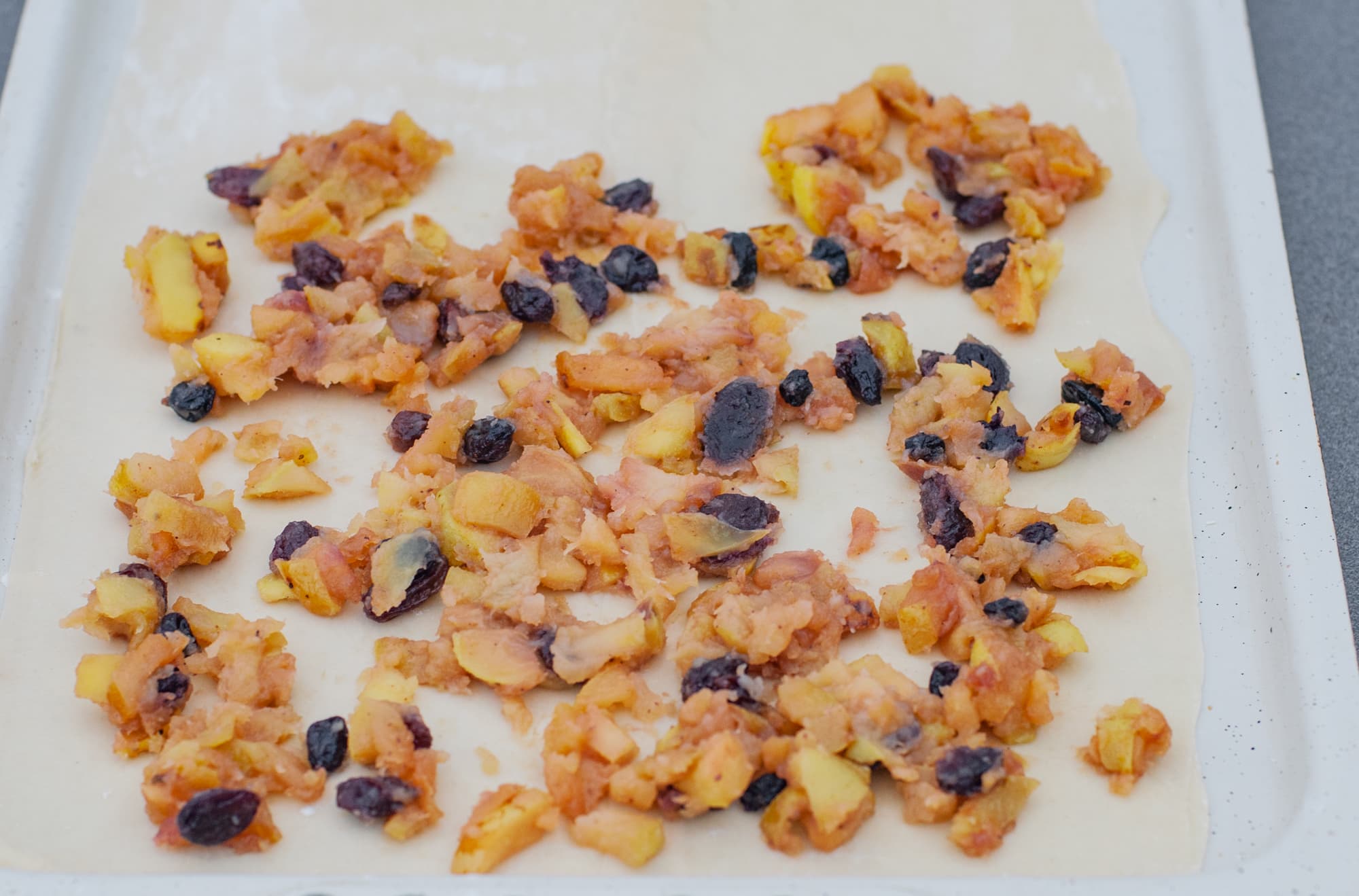 Сначала подготовили начинку — кислые яблоки порезали небольшими кубиками и обжарили их на сковороде на сливочном масле с карамелизованным сахаром с добавлением рома, изюма и корицы до полуготовности. Дали остыть.