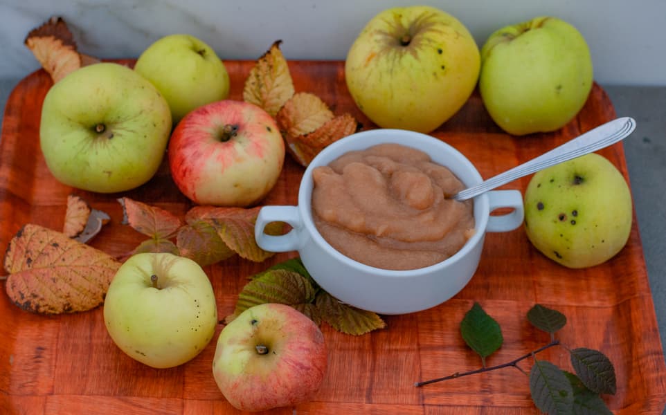 Приготовили яблочное повидло для зефира и пастилы. Для этого печеные яблоки протерли через сито и уварили их с добавлением сахара до половины исходного объема.