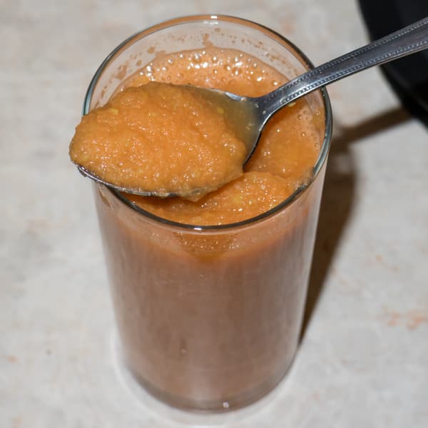В готовом напитке практически неразличимы отдельные фрагменты яблок или моркови. Масса густая, однородная.