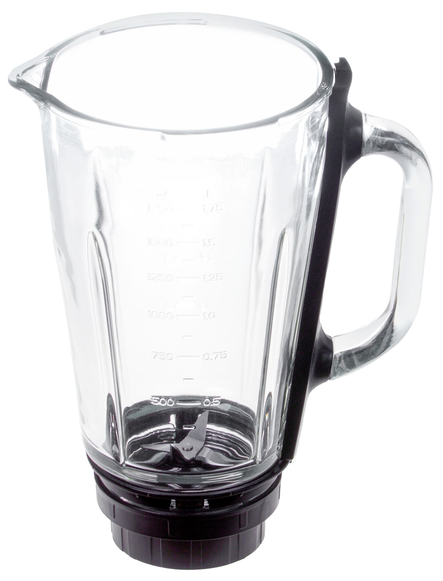 Чаша для смешивания изготовлена из стекла, имеет ручку и носик для облегчения слива готового продукта. Рабочий объем стакана — 1,7 л. На боковых сторонах нанесены отметки объема от 500 до 1750 мл, а также от 2 до 7 чашек или от 16 до 56 унций. Емкость примечательна своей формой с малым диаметром дна и довольно широкой верхней частью. Поскольку нижняя часть кувшина узкая, в нем можно будет перерабатывать небольшие объемы продуктов. На внутренней поверхности имеется четыре вертикальных выступа, обеспечивающих равномерное смешивание продуктов.