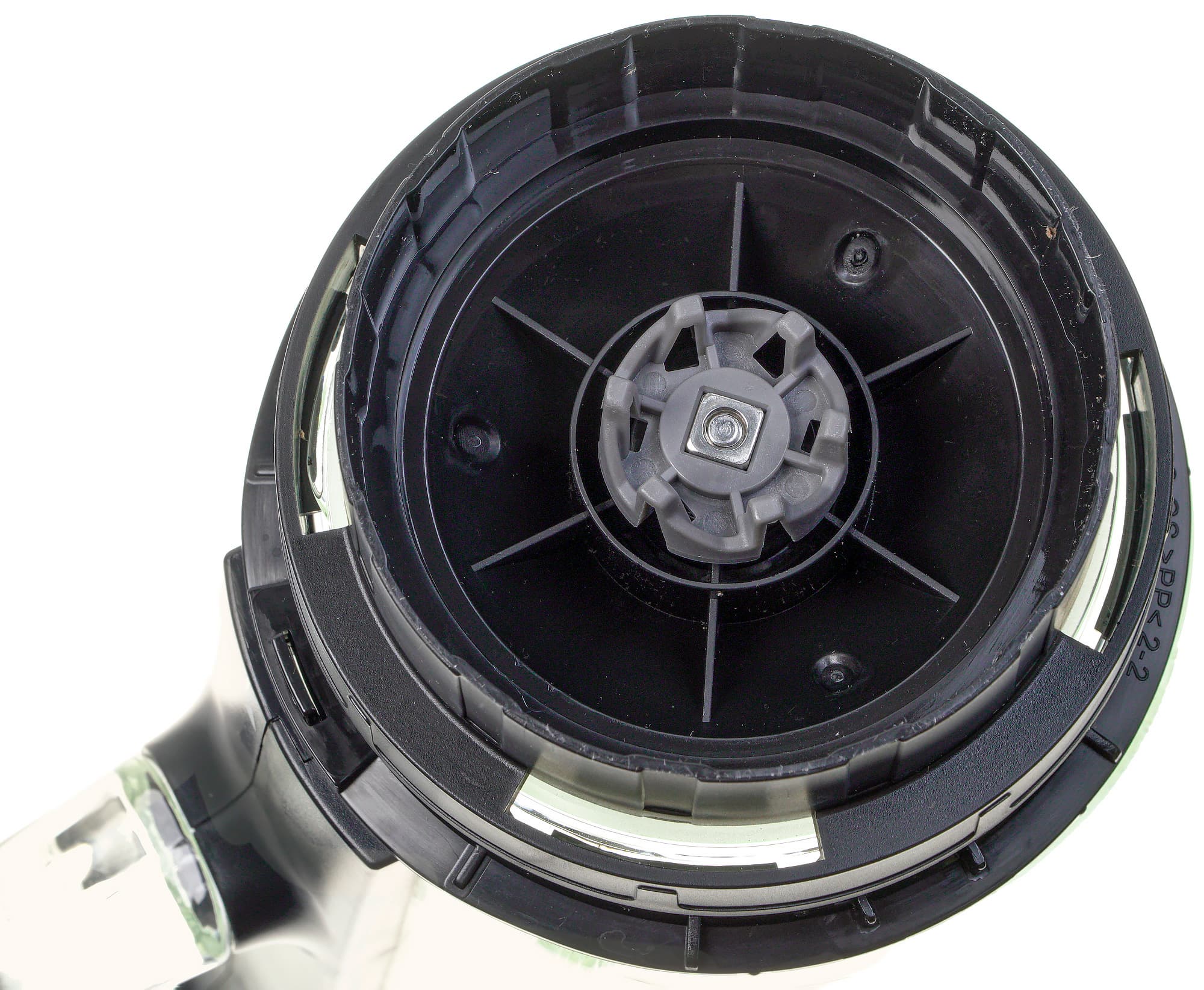 Крышка кувшина изготовлена из пластика черного цвета. Фиксируется на емкости с помощью двух боковых пазов, в которых размещаются выступы края стеклянного стакана. Пластиковая деталь, идущая вертикально вдоль ручки кувшина, является частью защитного механизма — если крышка закрыта неплотно, мотор не включится. С внутренней стороны крышки в месте соединения со стенками чаши имеется два ряда уплотнителей. В центре — традиционное отверстие диаметром около 4,5 см, закрываемое мерным колпачком. Колпачок плотно вставляется, никакого фиксирующего крепежа не предусмотрено. На стаканчике нанесены отметки объема от 5 до 25 мл с шагом в 5 мл.