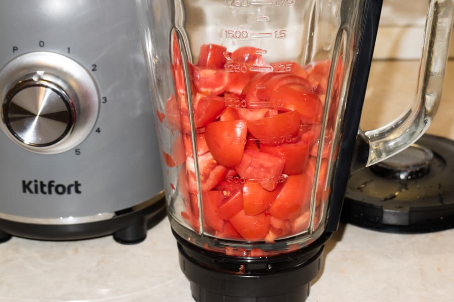 Через минуту выключили блендер и оценили результат. В томатной массе встречались кусочки шкурки и крупно размолотые косточки. Продолжили взбивать дальше на пятой скорости. По завершении еще одной минуты работы результат значительно улучшился: кусочки шкурки и семян стали гораздо мельче, масса — однороднее.