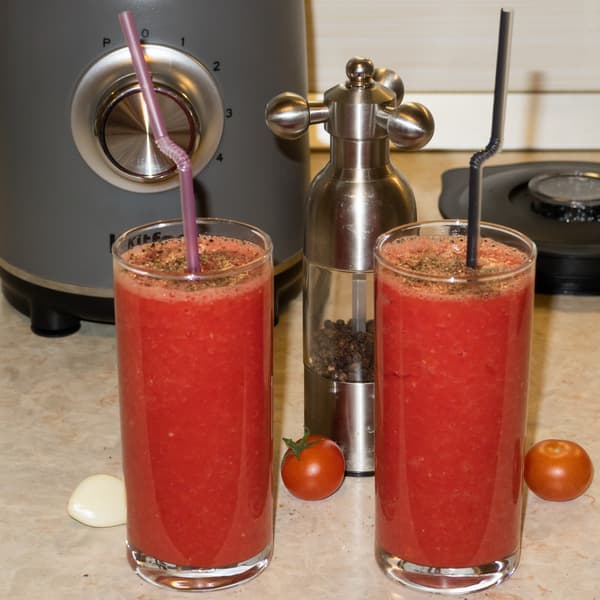 Из взбитых томатов решили приготовить томатный фреш — добавили пару зубчиков чеснока, немного соли и черного перца. Измельчали еще 30 секунд на максимальной скорости. В итоге получили неплохо взбитый томатный смузи, в котором не встретилось ни единого различимого фрагмента чеснока.