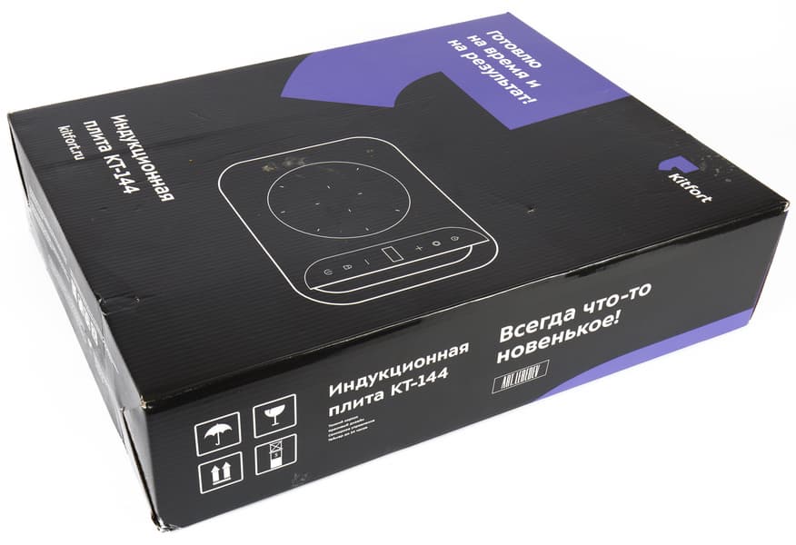 На тесты плитка пришла в небольшой картонной коробке черно-синего цвета. Коробка оформлена в стандартном корпоративном стиле Kitfort разработки студии Артемия Лебедева. На упаковке мы видим схематичное изображение прибора, название и рекламный слоган.