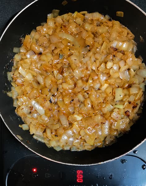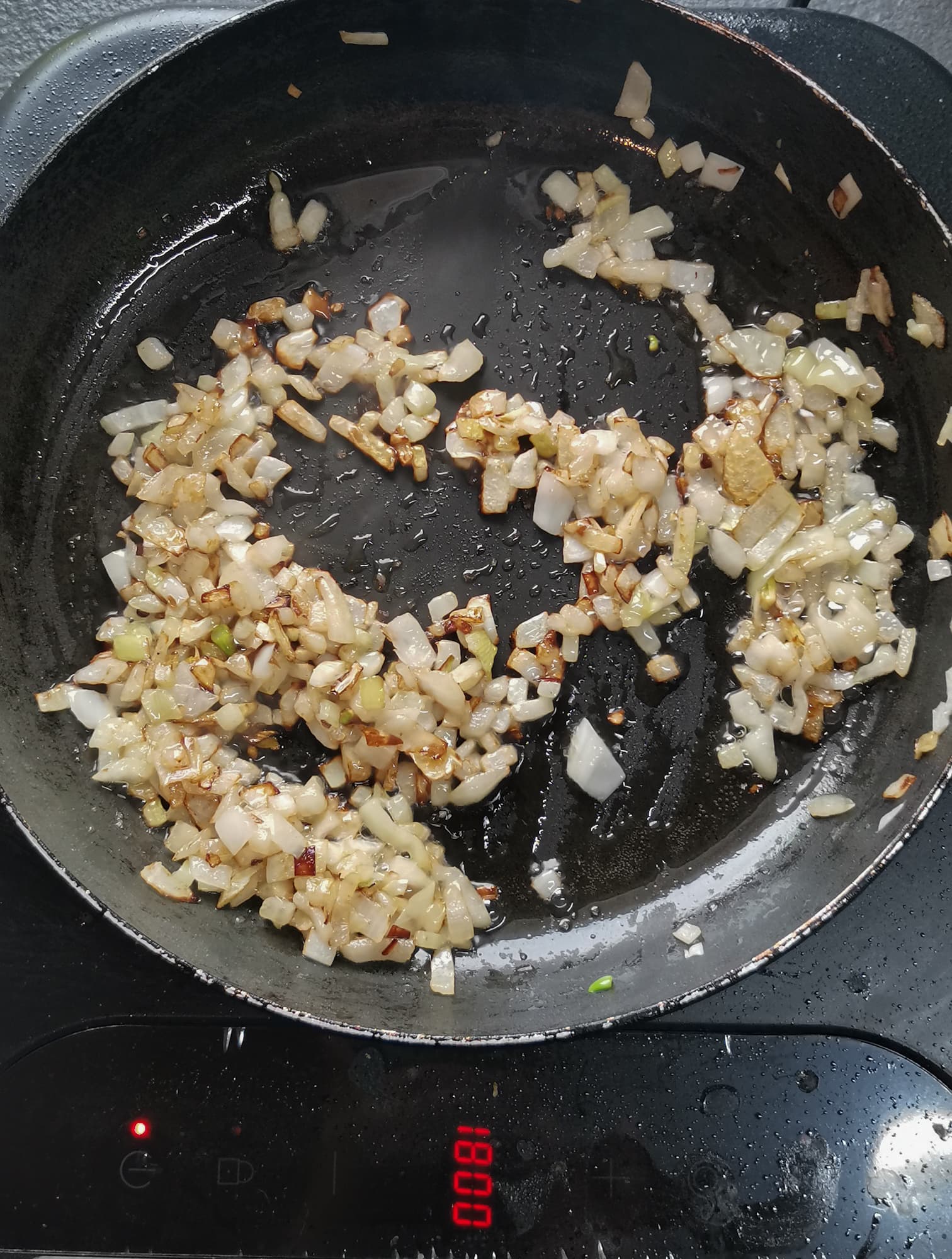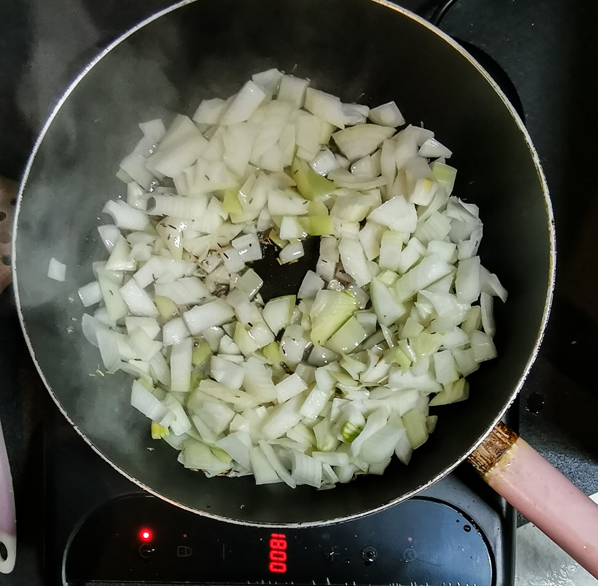 На максимальной мощности мы поджарили мелко нарезанный репчатый лук.