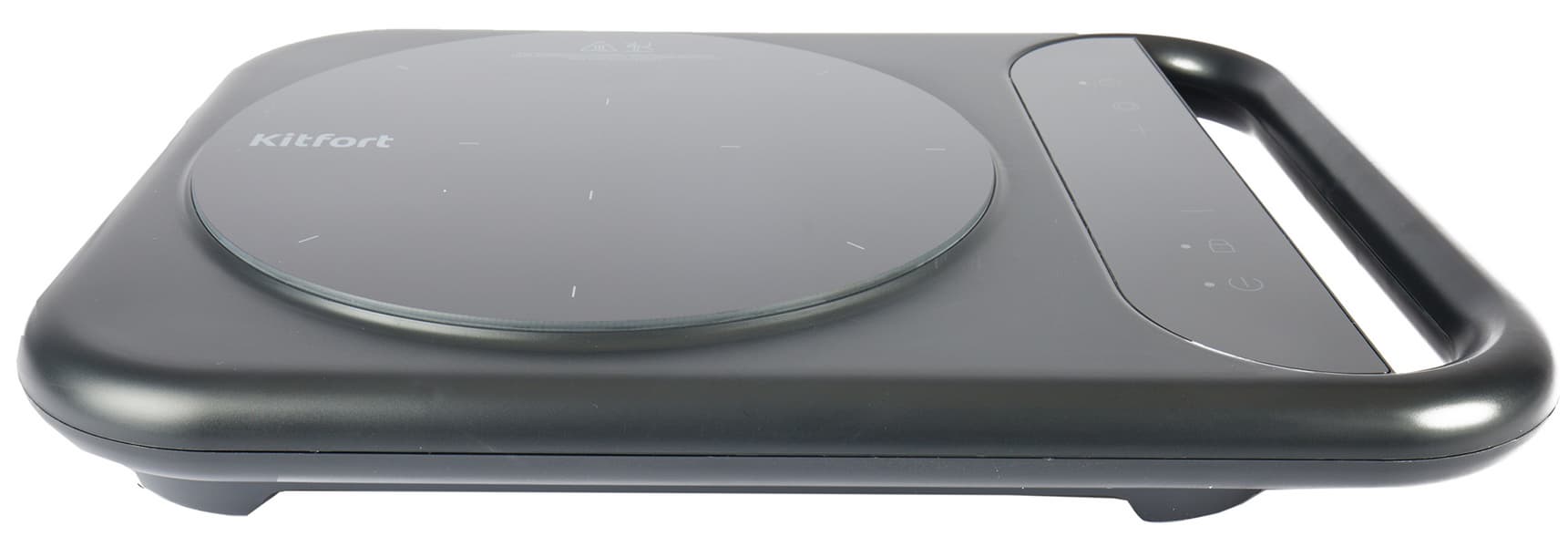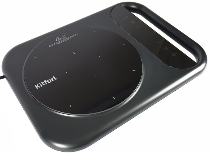 Kitfort KT-144 совсем не похожа на кухонную плитку — скорее, на весы. Индукционная варочная поверхность из стекла интегрирована в легкий пластиковый корпус со скругленными краями и большой ручкой для переноски.