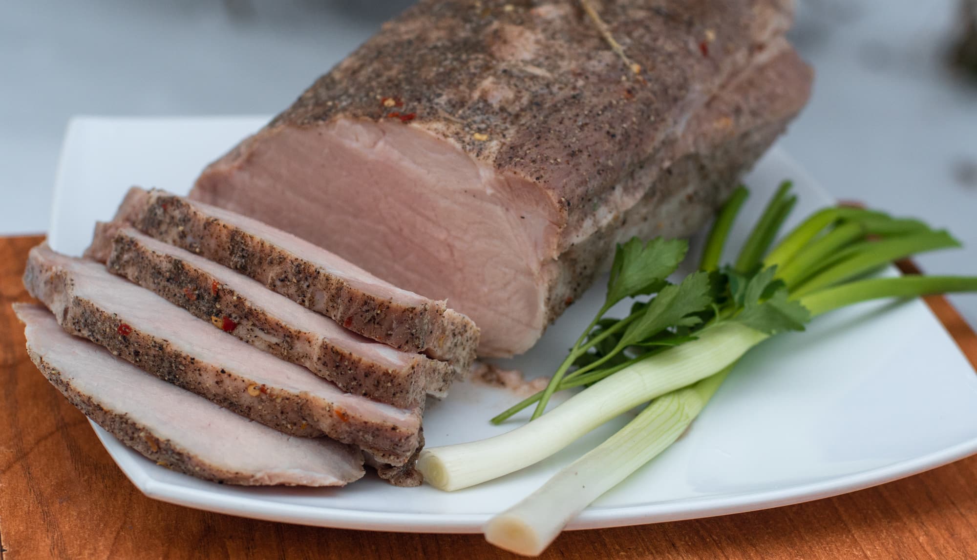 Мы взяли большой кусок свиной корейки, около 2,5 кг, обваляли в специях и завакуумировали.