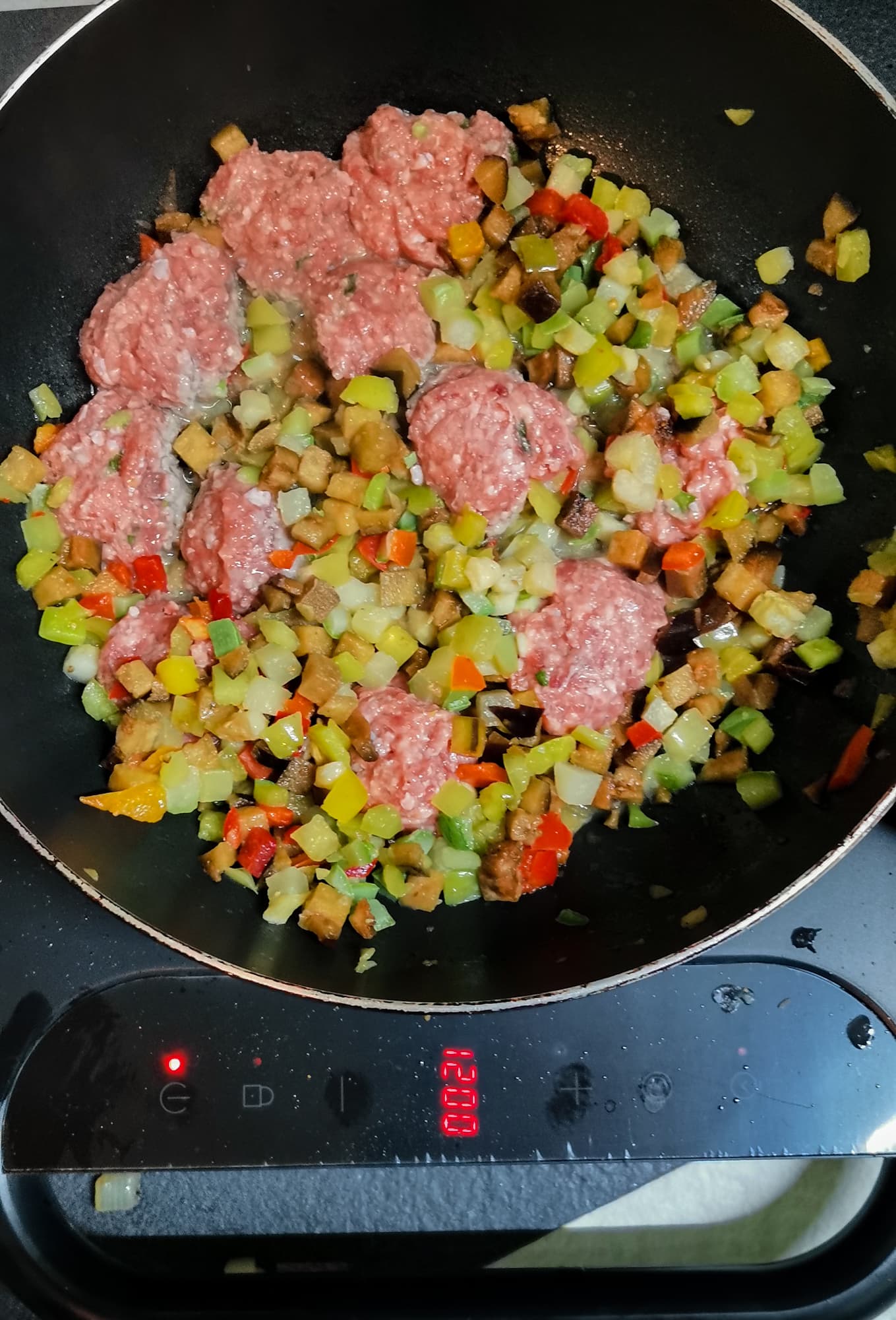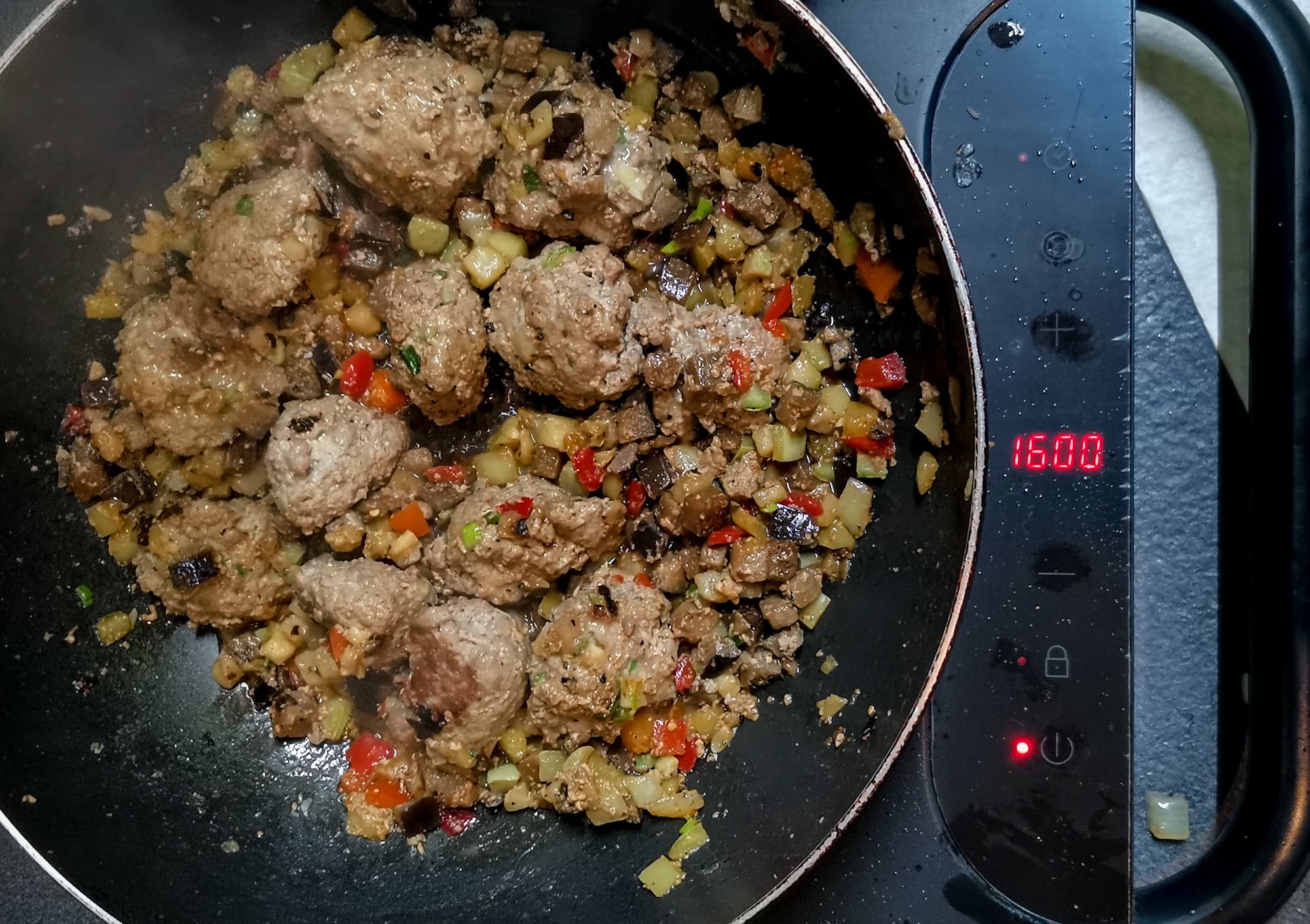 Овощи высыпали на сковородку при высокой мощности, и пока они размораживались и готовились, замесили фарш для фрикаделек. В полуготовые овощи аккуратно выложили небольшие кусочки фарша, выставили мощность 1600, закрыли крышкой.