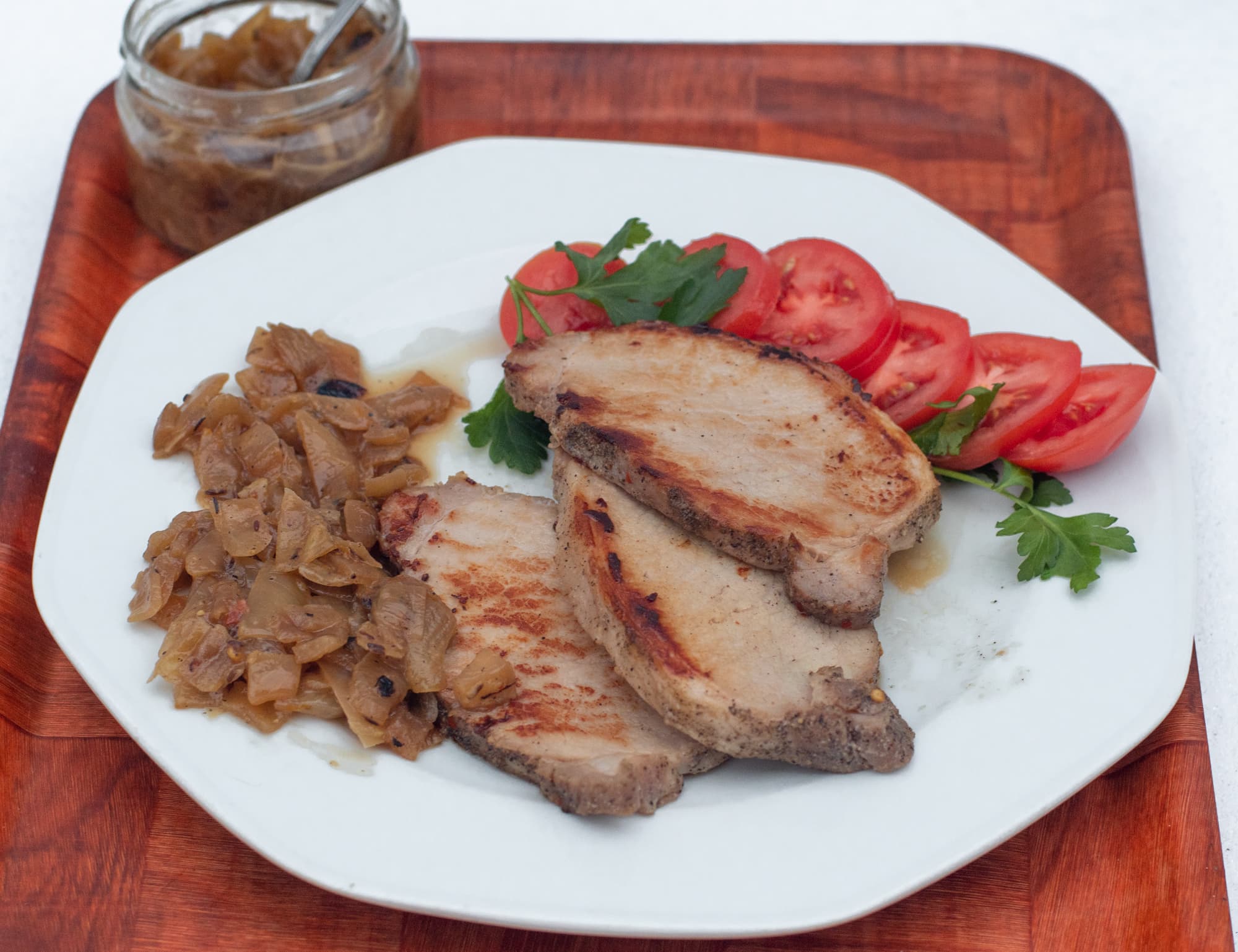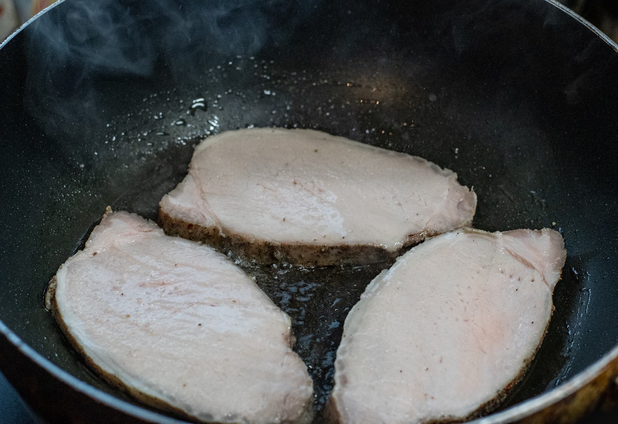 Корейка получилась розовая, достаточно сочная, но нежная. Для придания красивой корочки кусочки обжарили на сковородке.