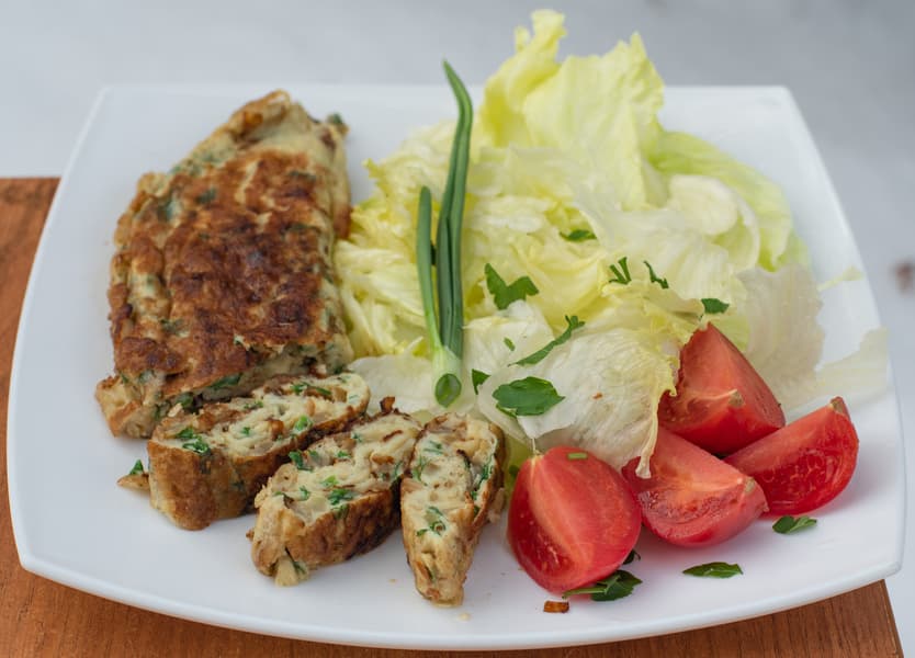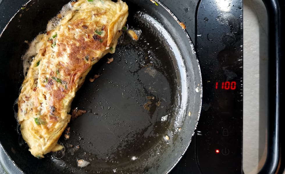 В этом рецепте самое главное — это корректный подбор температуры, чтобы было время на скручивание. Важно, чтобы слой омлета прожаривался снизу, но оставался жидким сверху для склеивания с основным рулетом. Плитка обеспечивает достаточно широкий диапазон регулировок для подбора температуры под любой размер посуды.