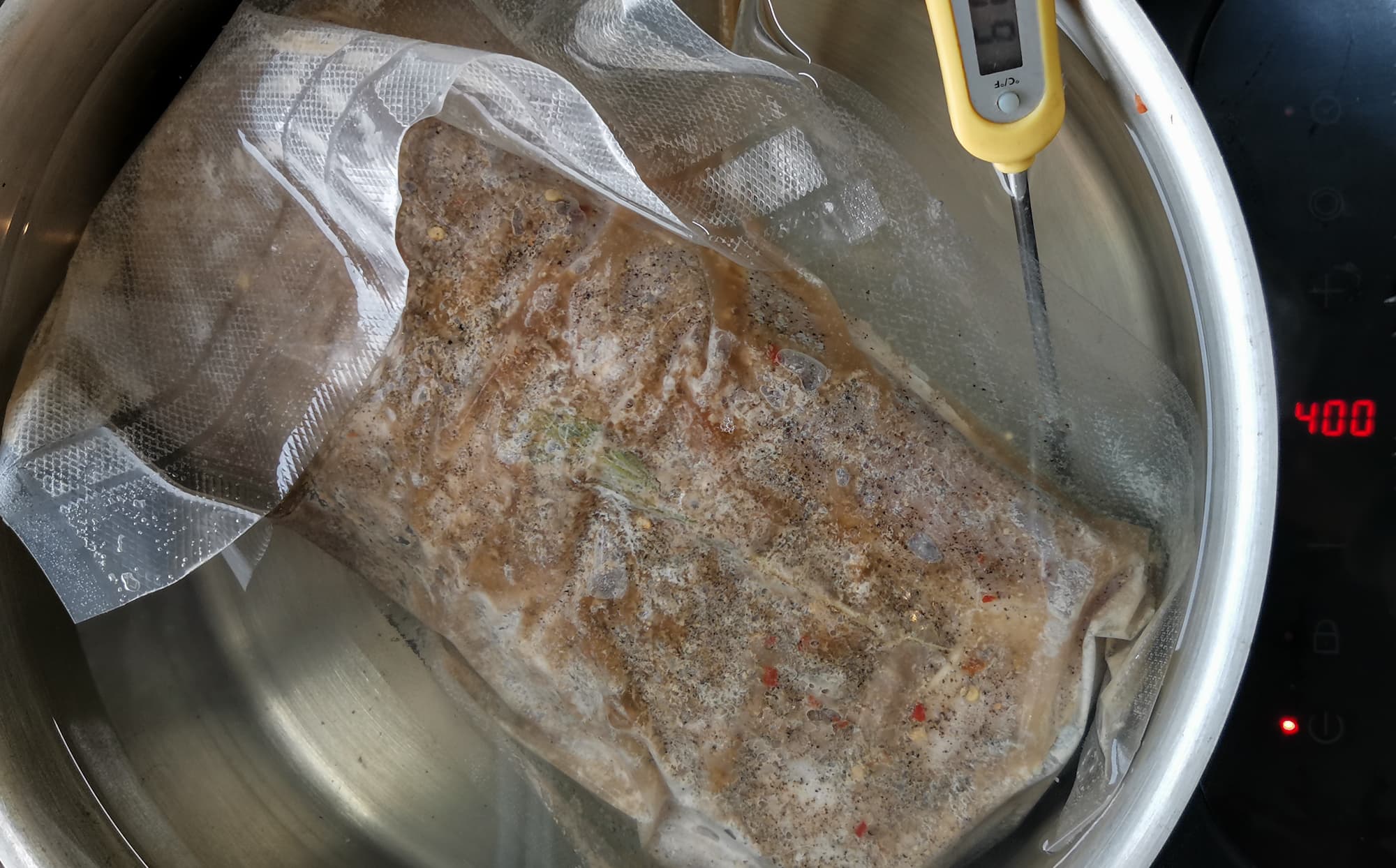 Положили в кастрюлю 9 л, залили водой, выставили мощность 400. Когда температура выровнялась в районе 62 °C, убавили мощность до 300. Периодически переворачивали мясо. Держали при постоянной температуре 61,5-62,5 °C в течение 3,5 часов.