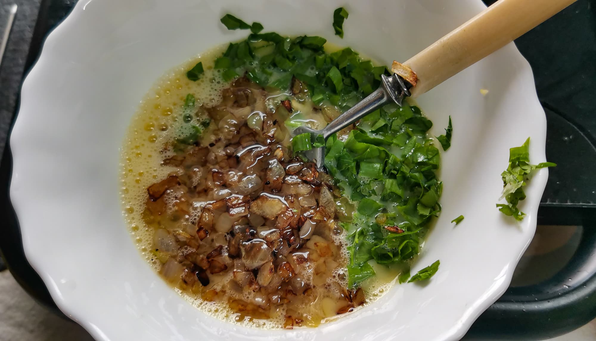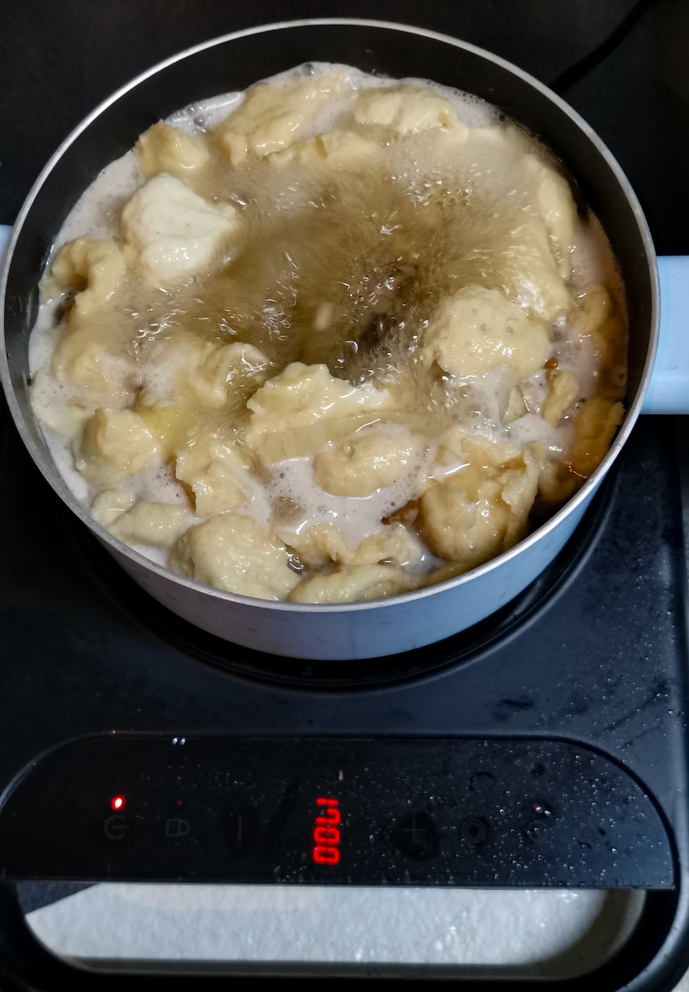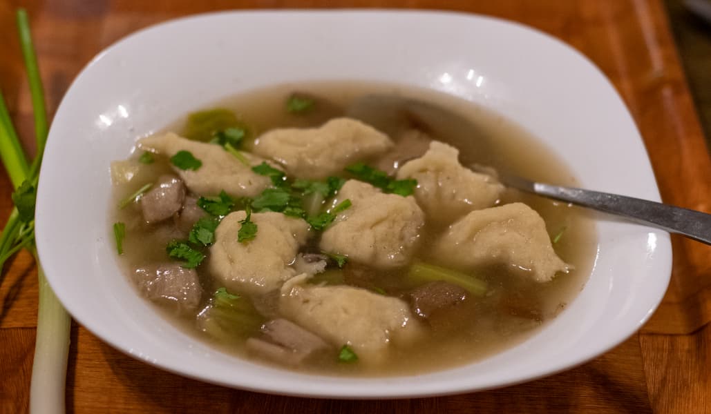 Для клецок сделали тесто из яиц, муки и сметаны.