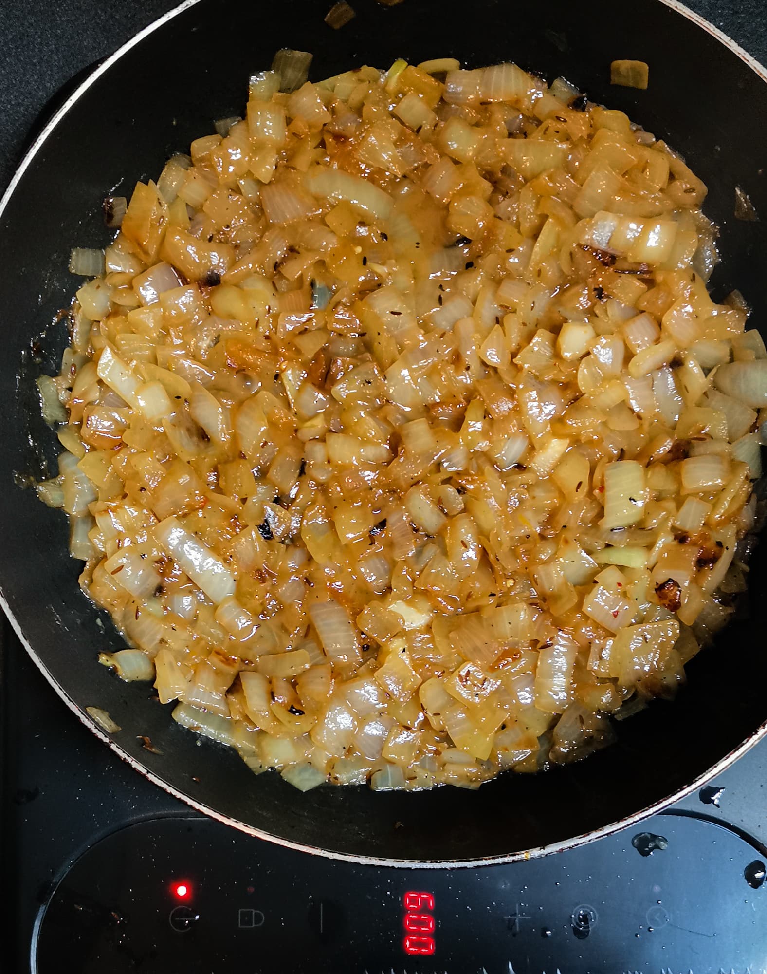 Для чатни мы взяли репчатый лук, масло, зиру, лимон, сахар, соль, острый перец чили и черный молотый. На сильно разогретую сковороду с маслом и зирой порциями выкладывали нарубленный лук, доводили его до обжаренного состояния и перекладывали в другую емкость.