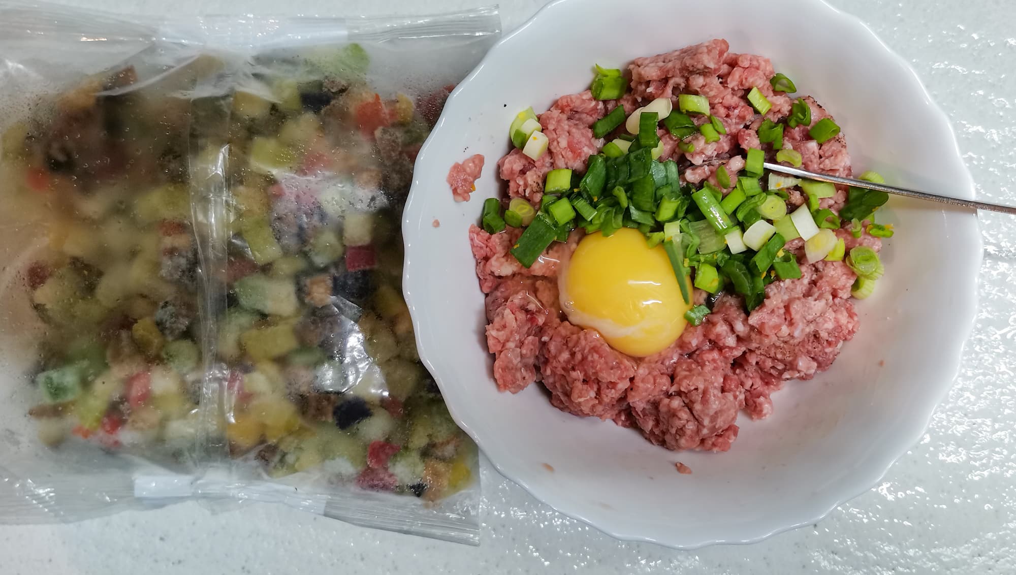 Мы взяли пачку замороженных овощей, немного фарша, яйцо и зелень.