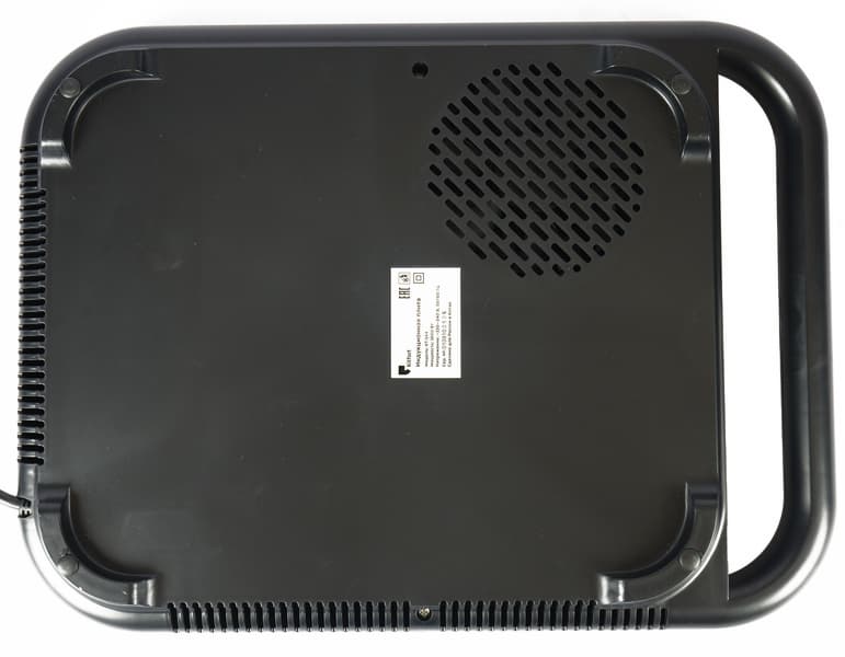 Вентиляционные и воздухозаборные решетки находятся снизу. На нижней стороне прибора наклейка с серийным номером и техническими характеристиками. Стоит плитка на 4 пластиковых удлиненных ножках, расположенных по углам нижней панели. Шнур питания выходит снизу сзади.