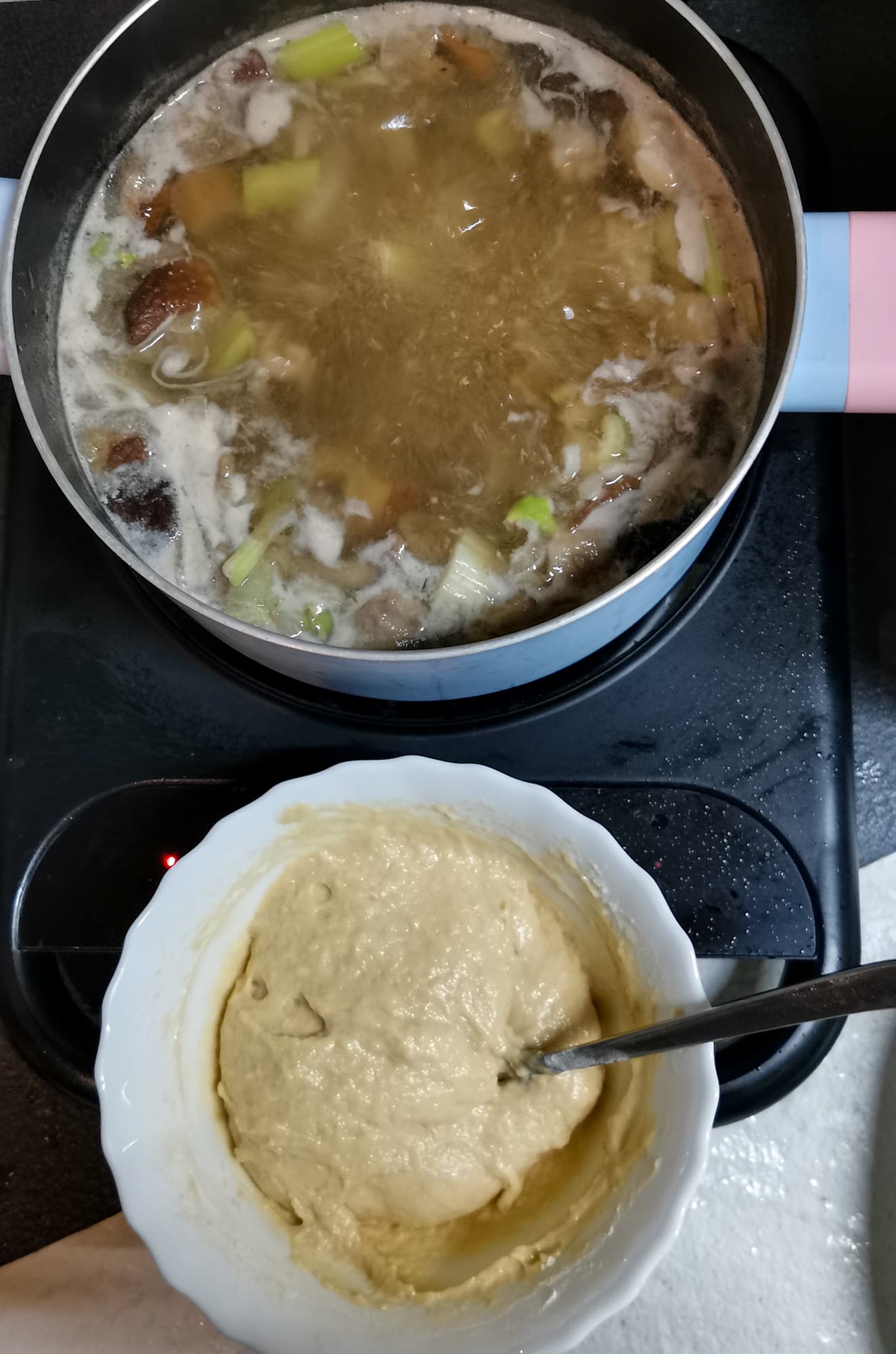 Из замороженных белых грибов, сельдерея и приправ мы приготовили грибной бульон.