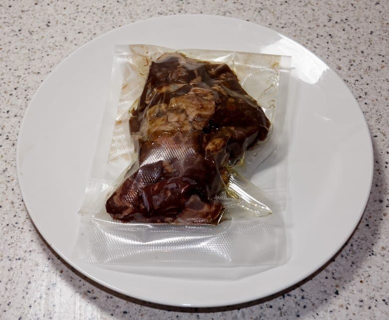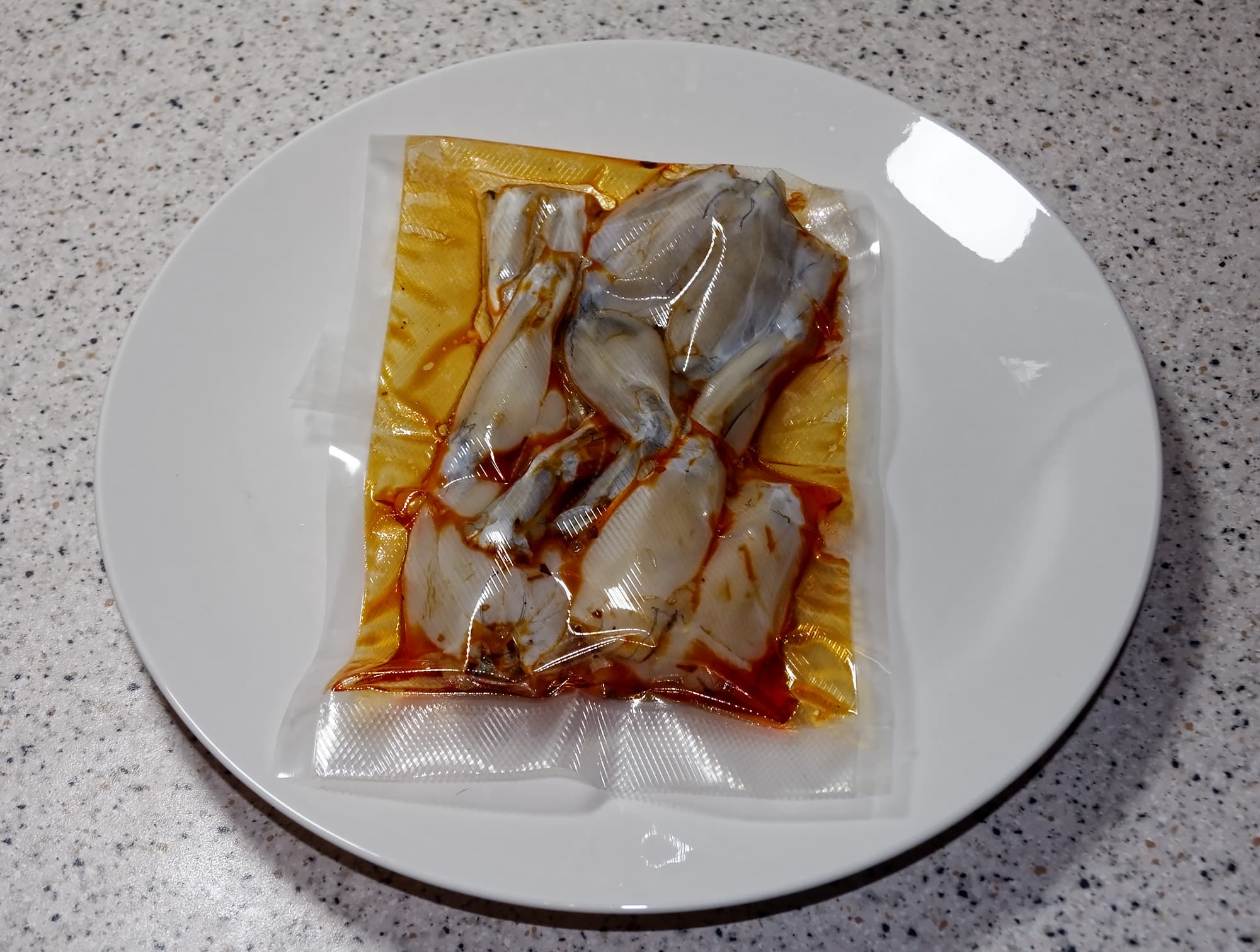 Вслед за олениной в вакуумный пакет отправились и обнаруженные в морозилке лягушачьи лапки (к ним мы добавили оливковое масло с хлопьями красного перца, соль и раздавленные зубчики чеснока).
